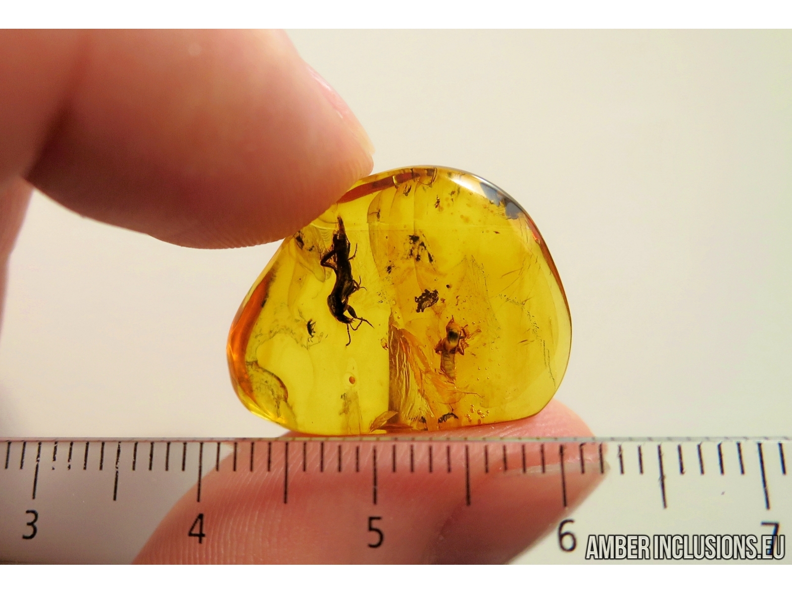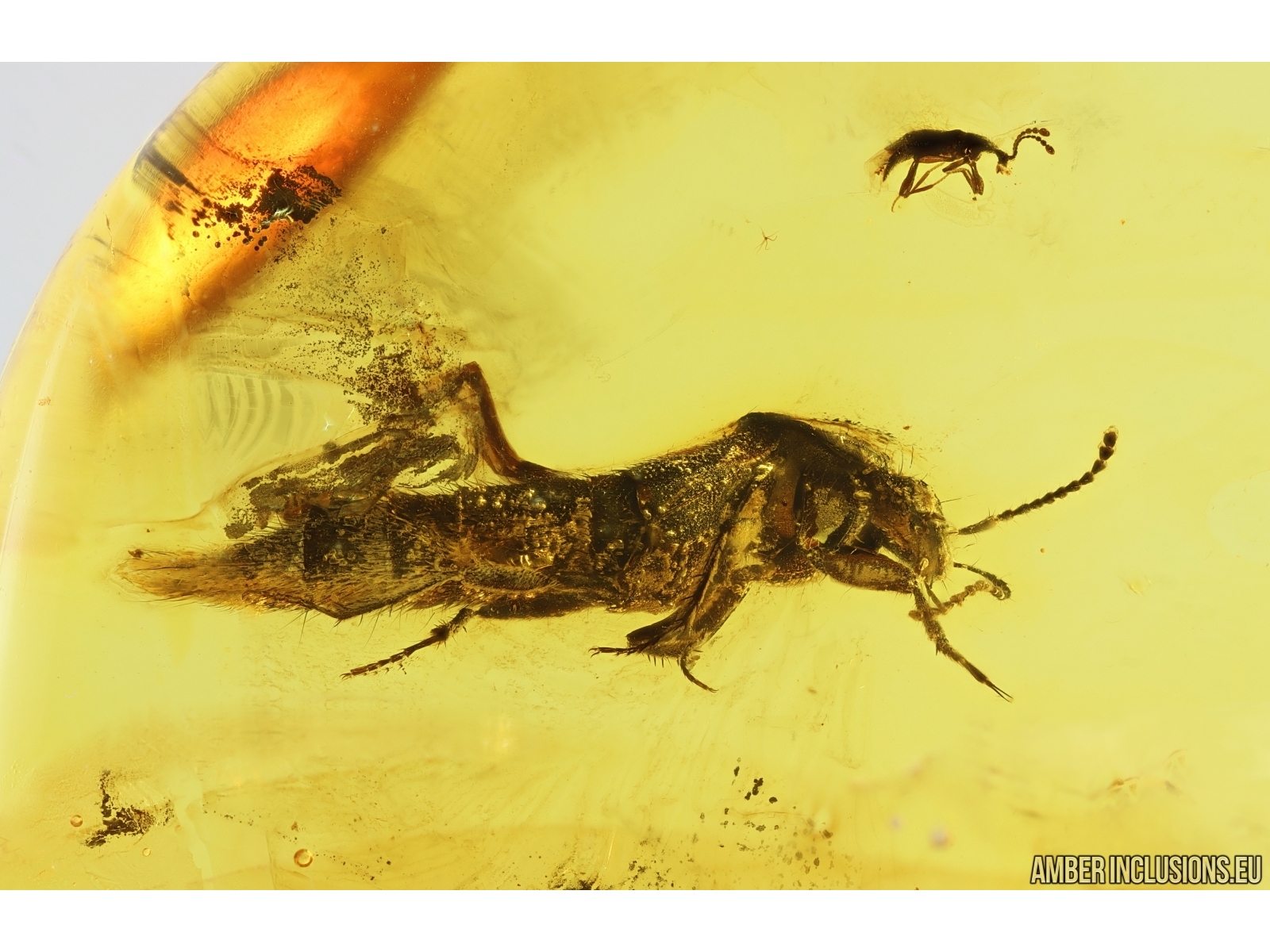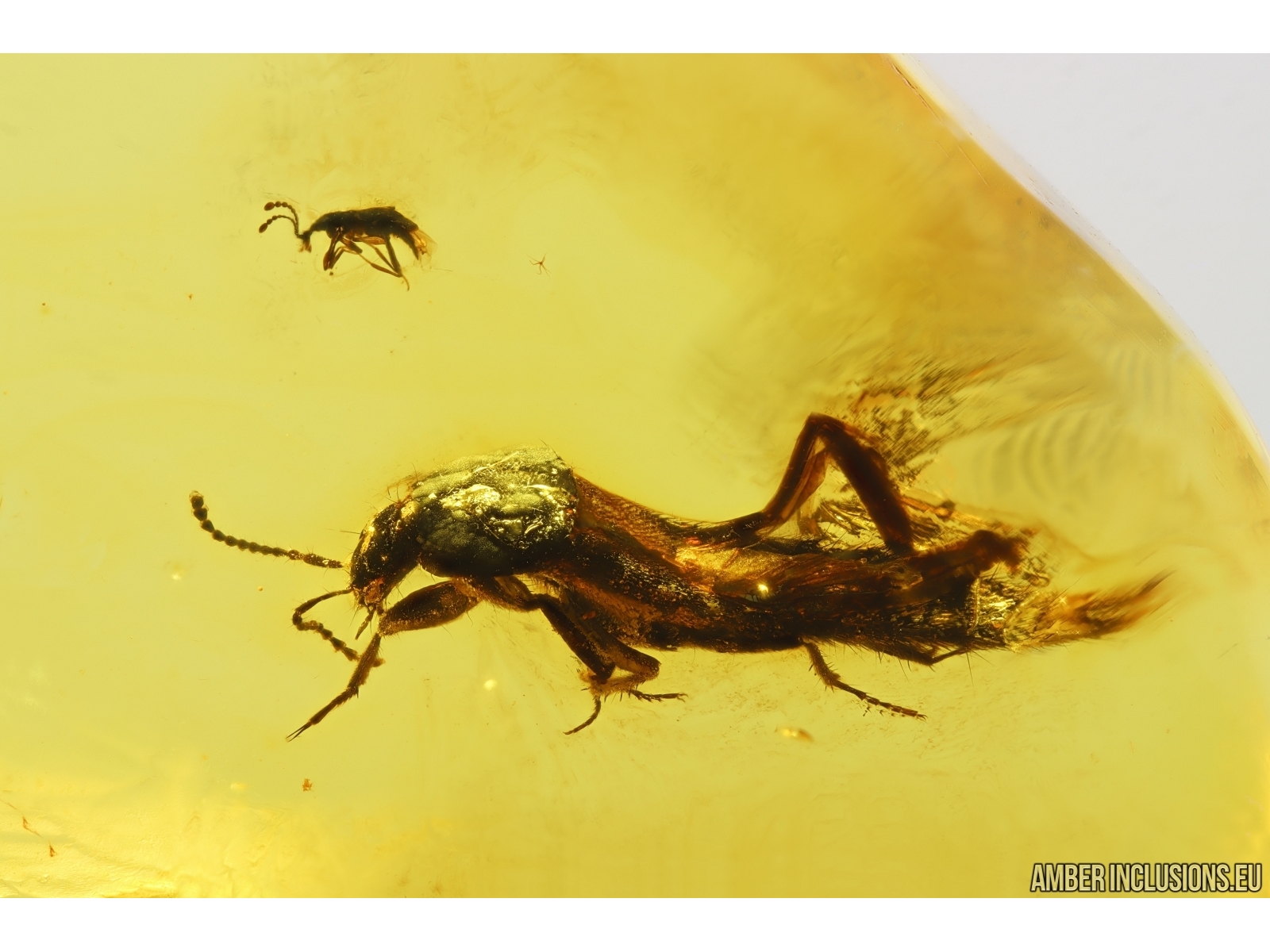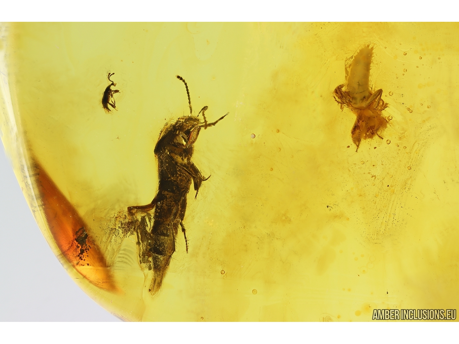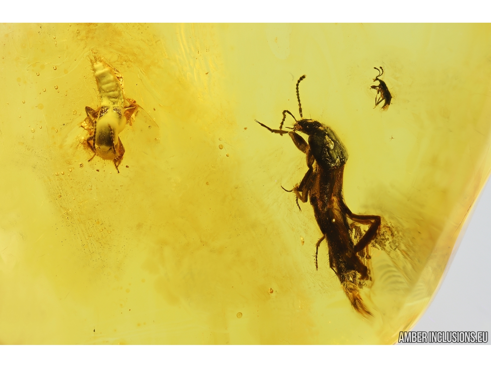 Baltic amber stone with fossil inclusions, trapped 34-56 million years ago - 3 Rove beetles Staphylinidae and More.