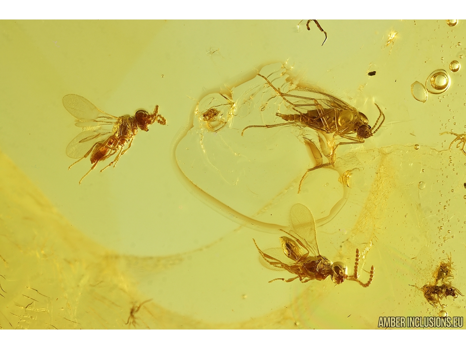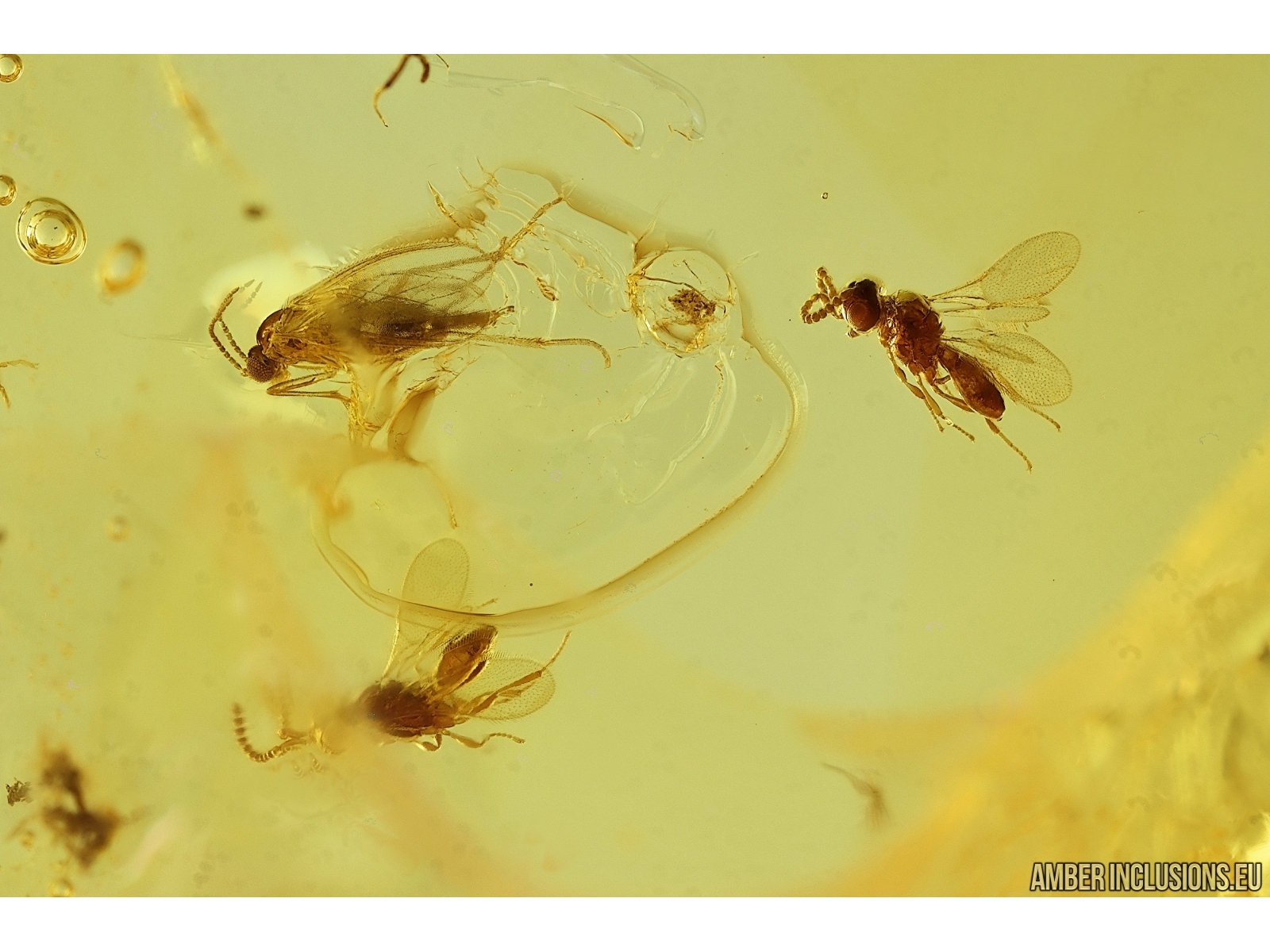 Baltic amber stone with fossil inclusions, trapped 34-56 million years ago - 3 Wasps Hymenoptera: ?Platygastridae, 2 Long-legged flies Dolichopodidae and Mites Acari.