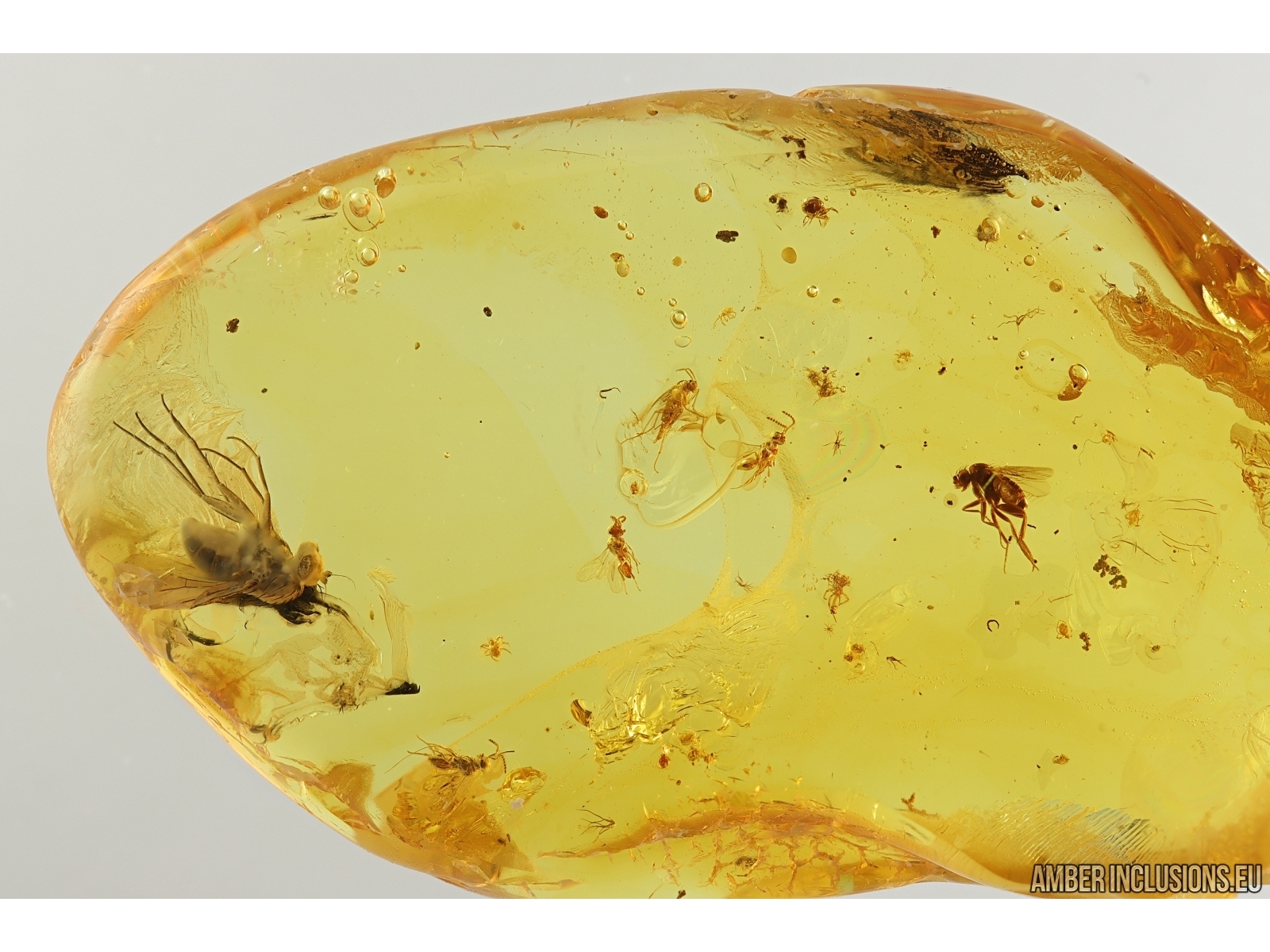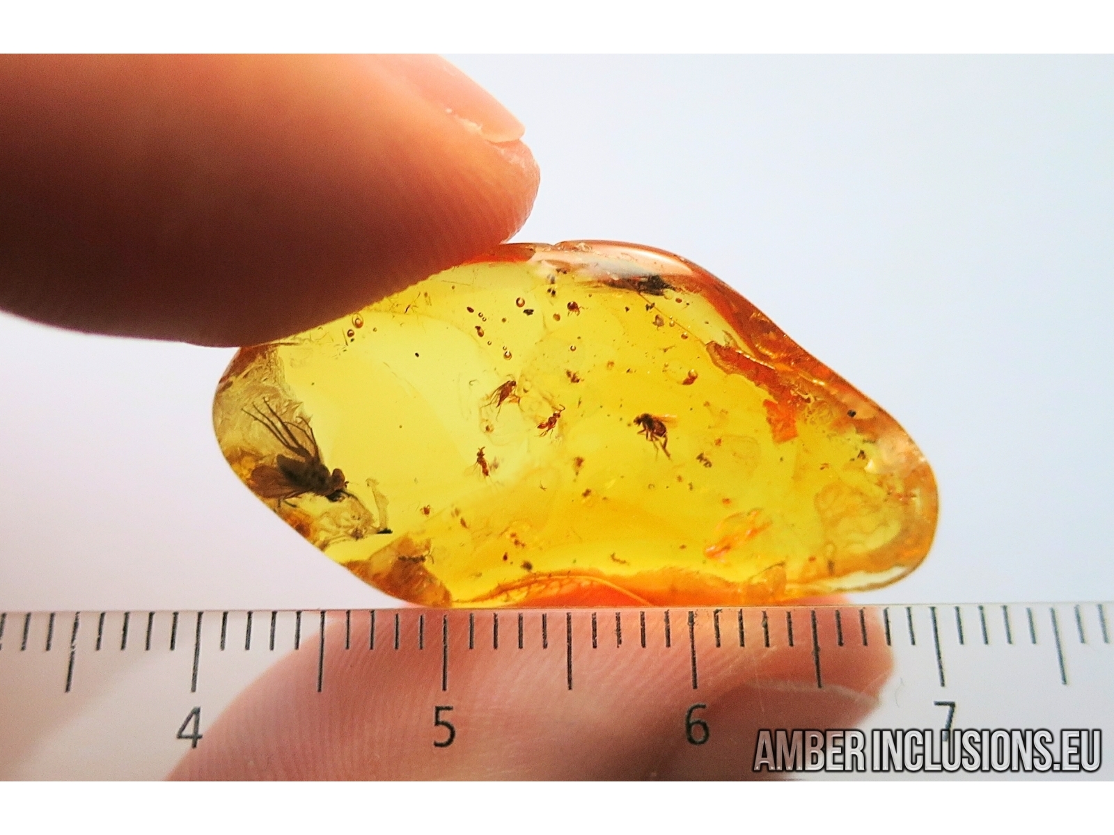 It weighs 1.6 g. Measurements of stone 31x16x5mm, length of flies ~2mm, wasps ~1.1mm,