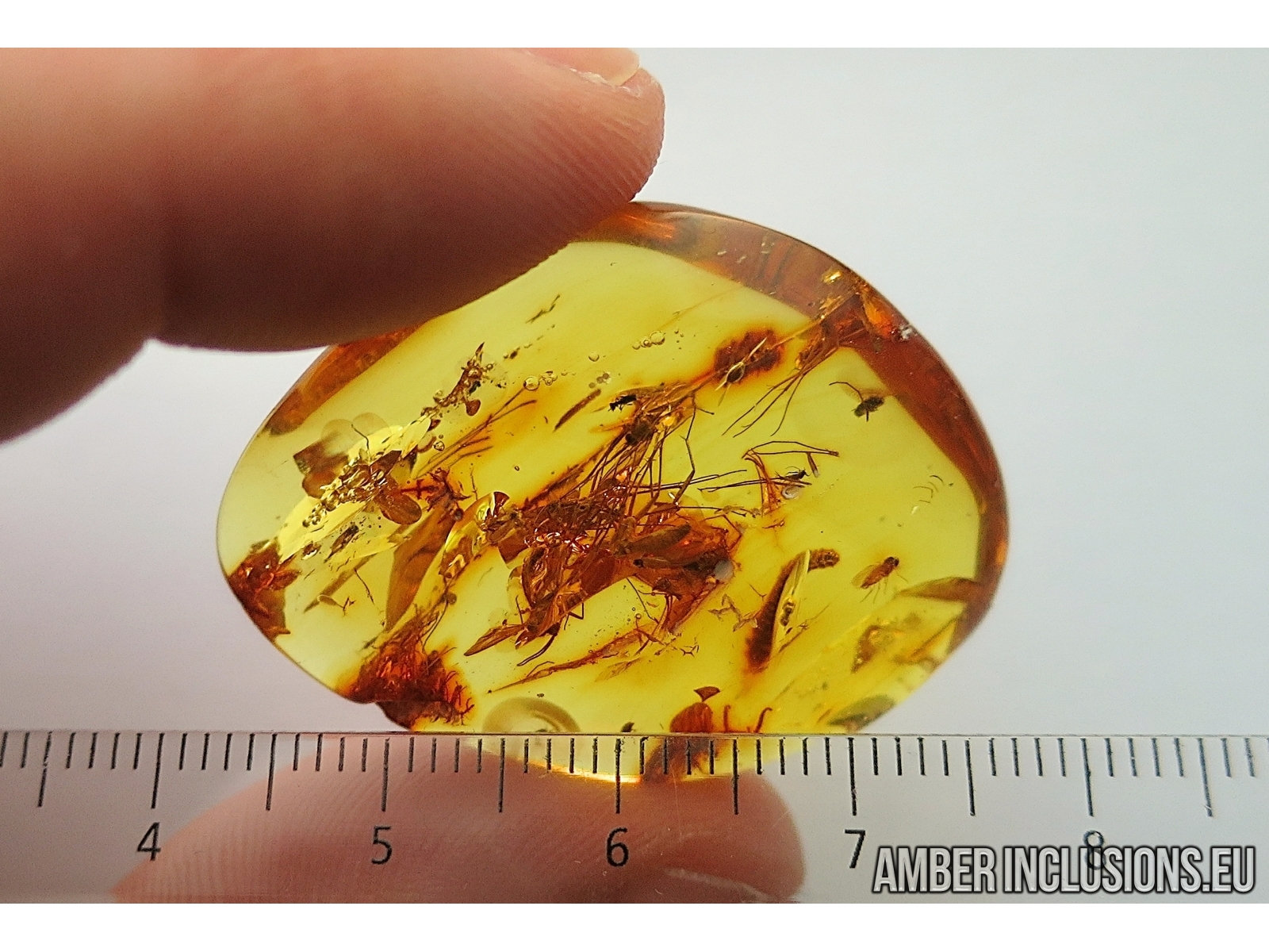It weighs 6.2 g. Measurements of stone 36x28x11mm, length of each beetle ~1.2mm, gnats ~4mm.