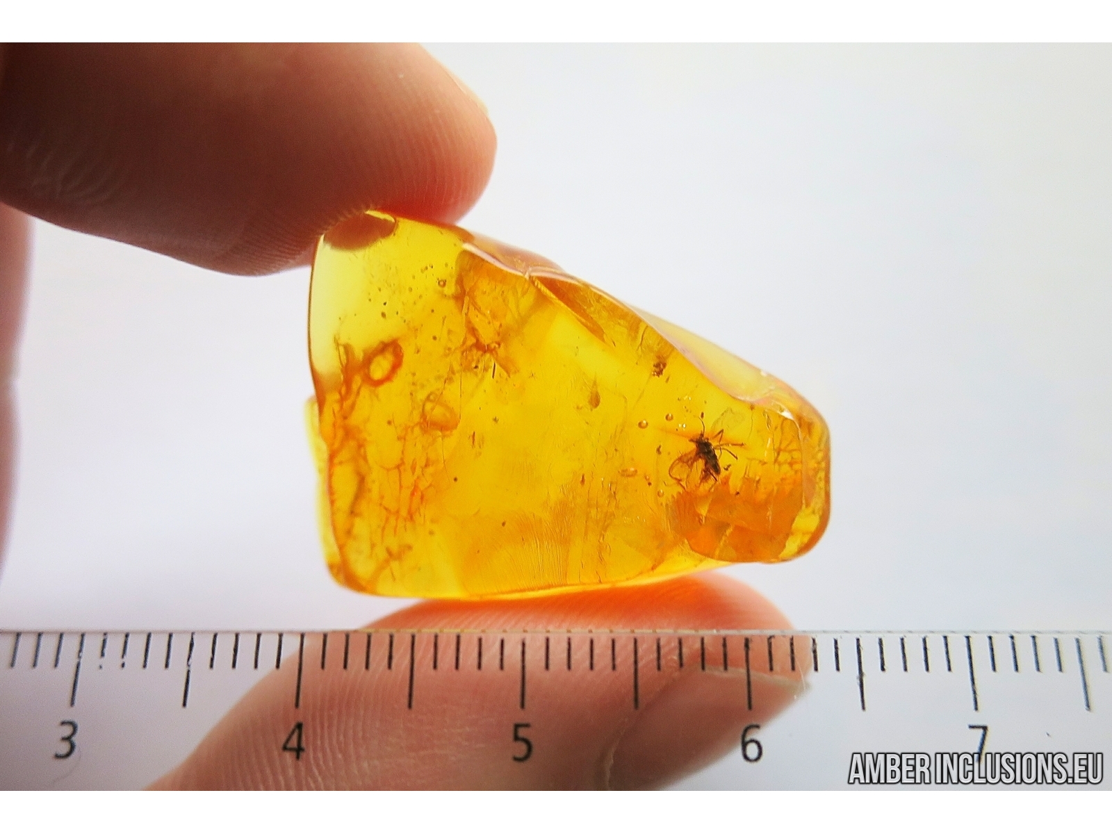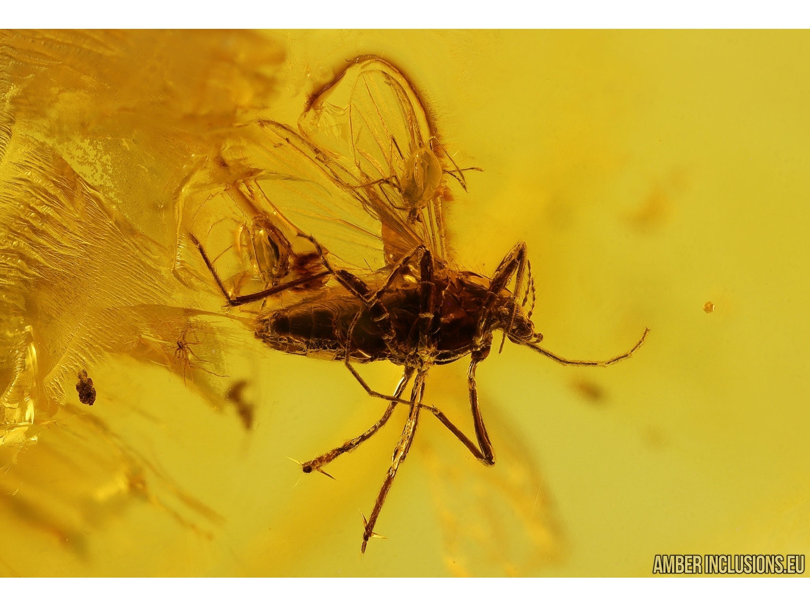 Baltic amber stone with fossil inclusion - Action! True midge Chironomidae with Two Mites Acari