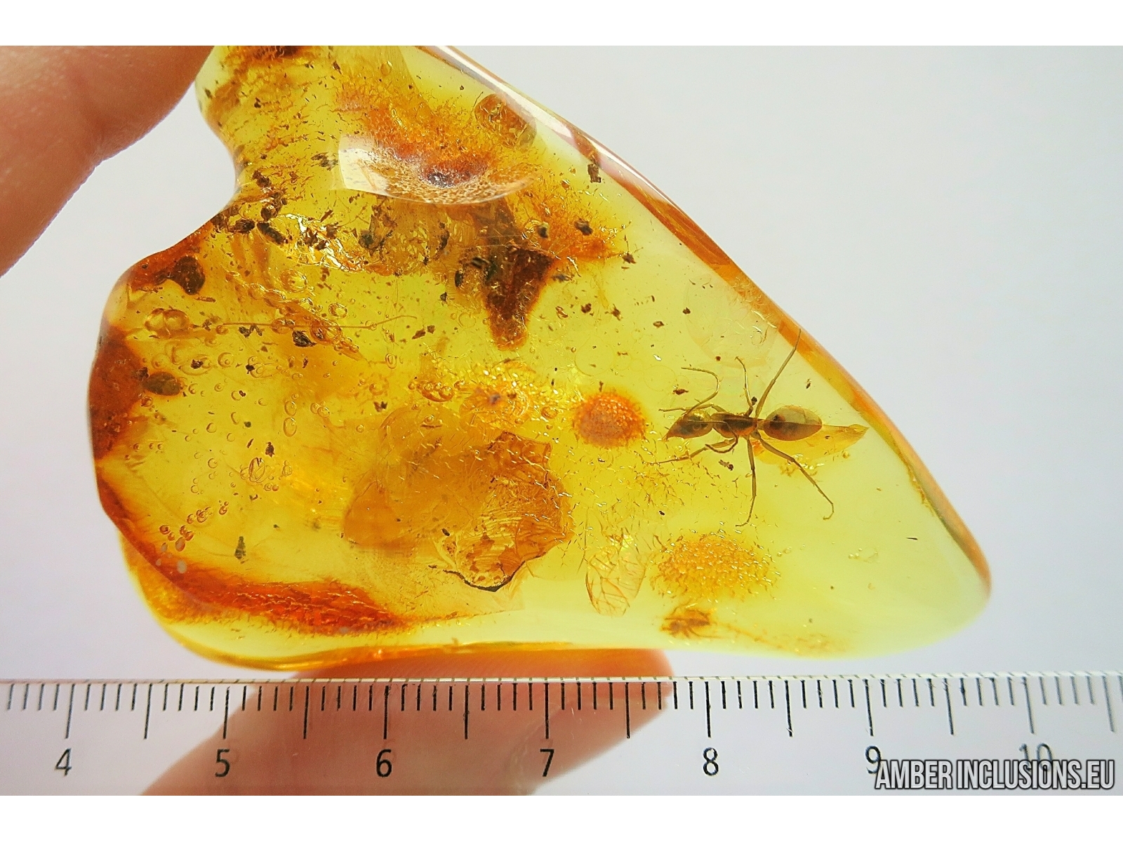 Ukrainian Rovno amber stone with fossil inclusions, trapped 34-56 million years ago - Big Ant Formicidae Damzenomyrmex ribbeckei and Spider.
