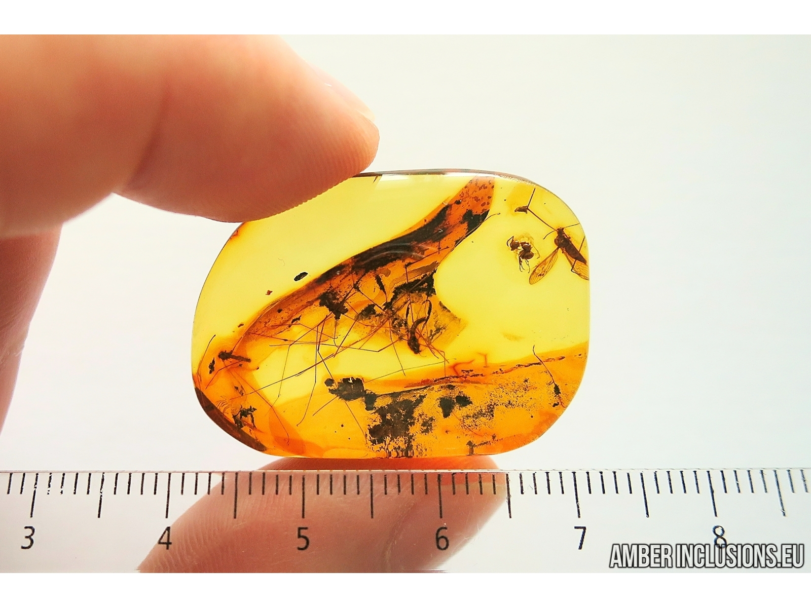 Baltic amber stone with fossil inclusions, trapped 34-56 million years ago - Ant Lasius schiefferdeckeri, Crane fly Limoniidae and Caterpillar case Lepidoptera.