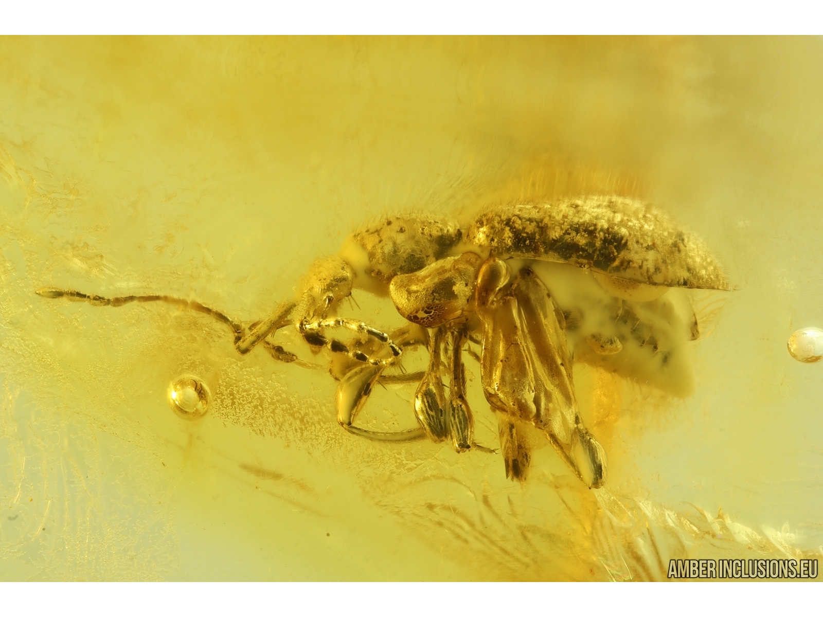 It weighs 0.9 g. Measurements of stone 21x11x5mm, length of beetle ~2.3mm.