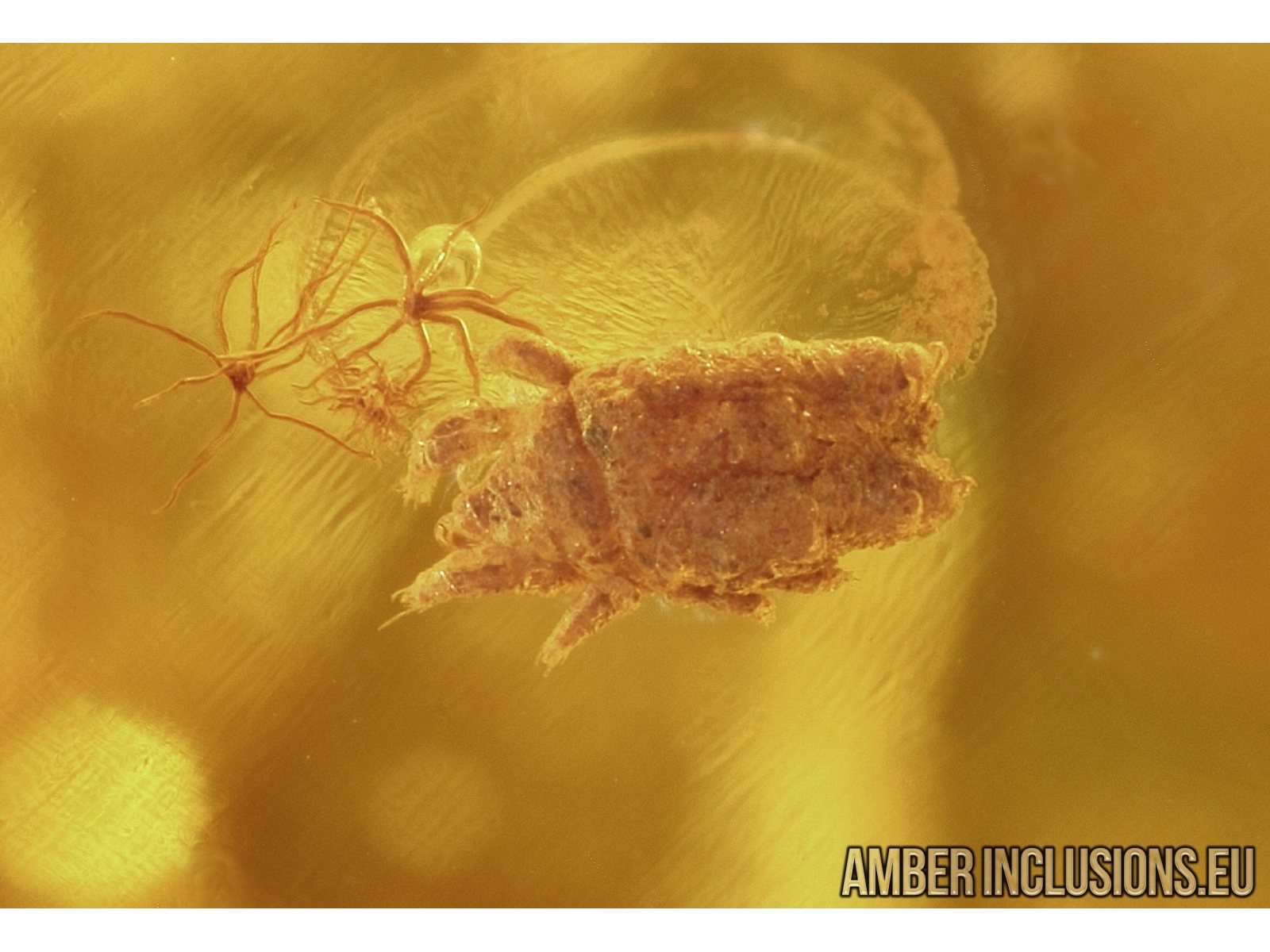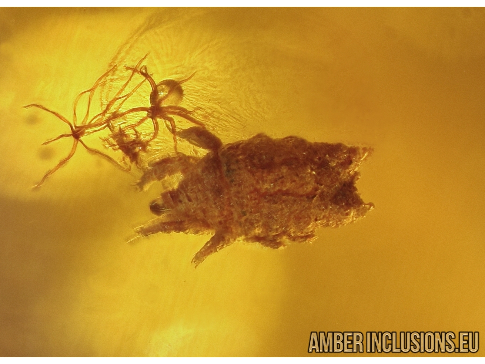 Amber Inclusions » MYRIAPODS, MYRIAPODA » Big Centipede Myriapoda, Mite Camisidae?, Coccid larva, Aphid, Spider head and More. Fossil inclusions in Baltic amber #6232