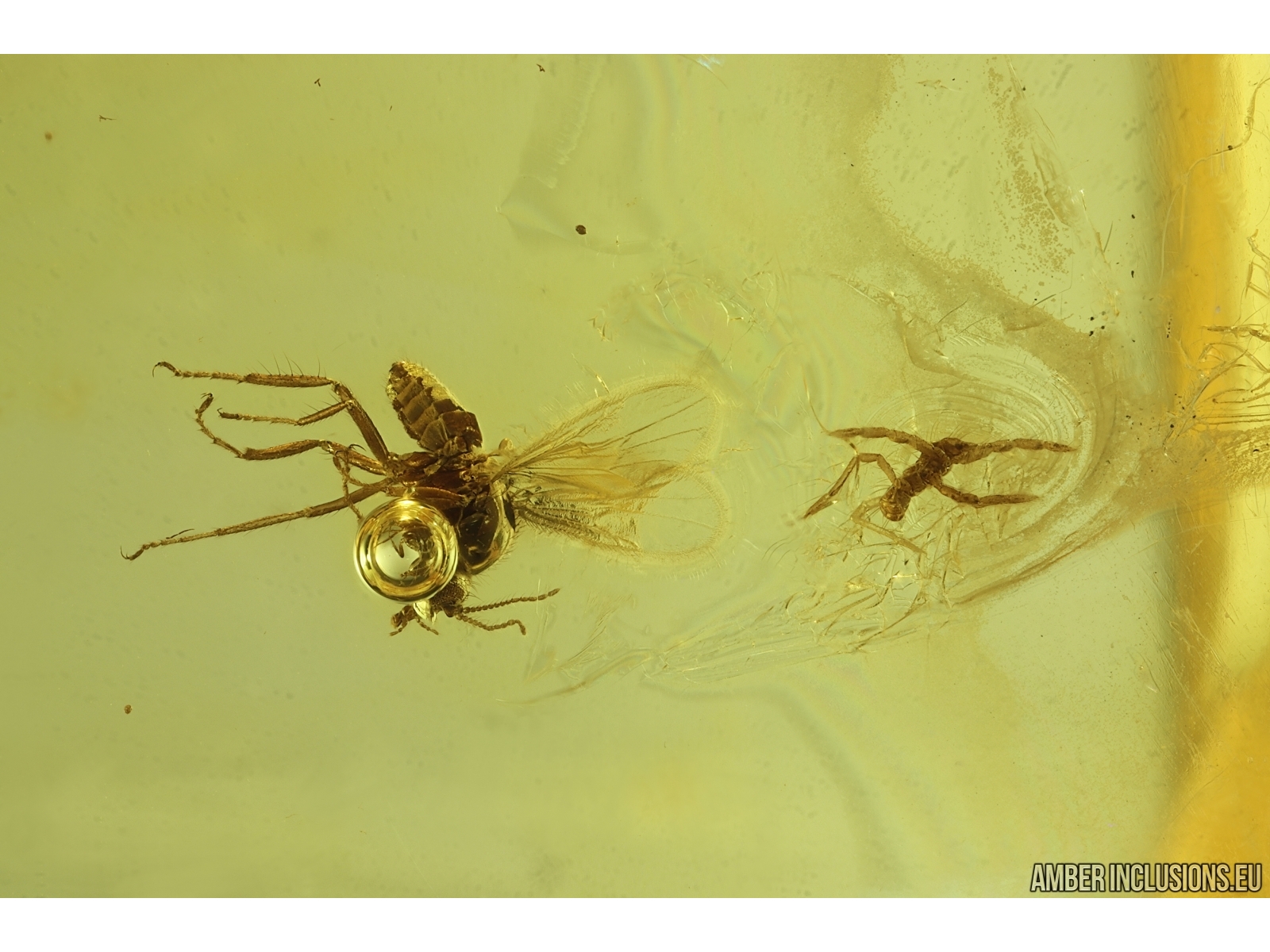 Baltic amber stone with fossil inclusion, trapped 34-56 million years ago -Biting midge Ceratopogonidae and Mite Acari.