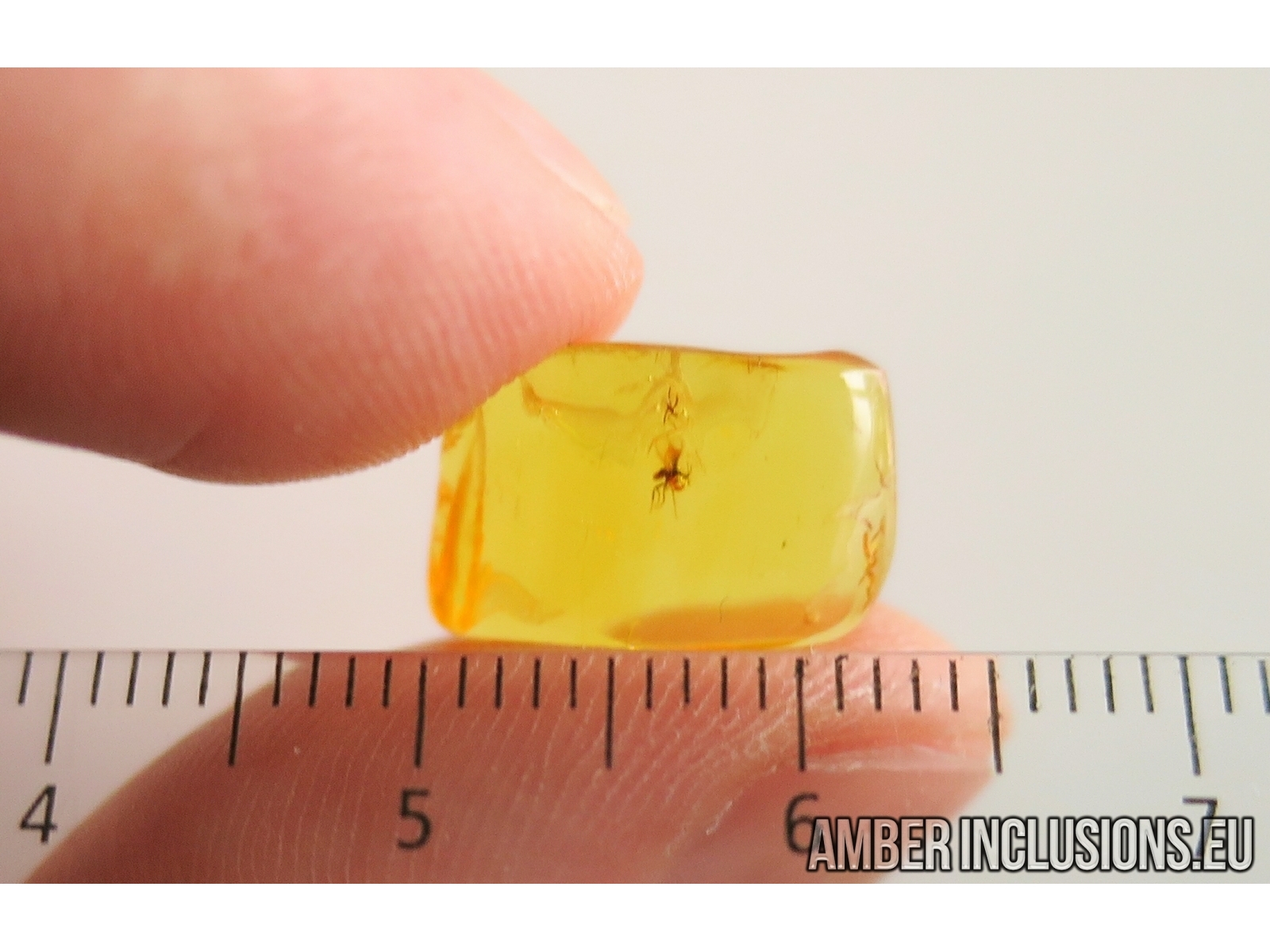 It weighs 0.4 g. Measurements of stone 14x10x4mm, length of midge ~0.8mm, mite ~0.5mm.