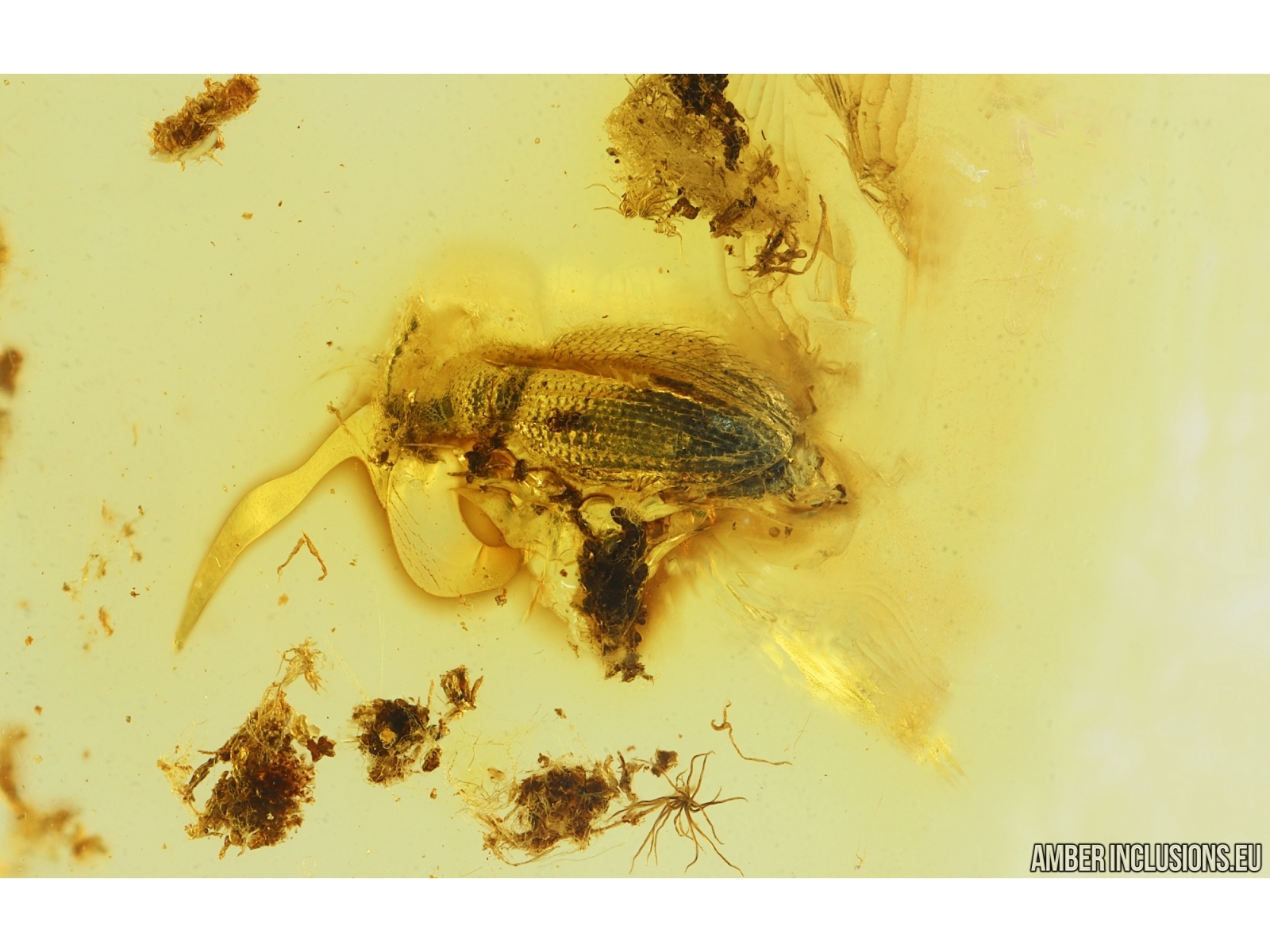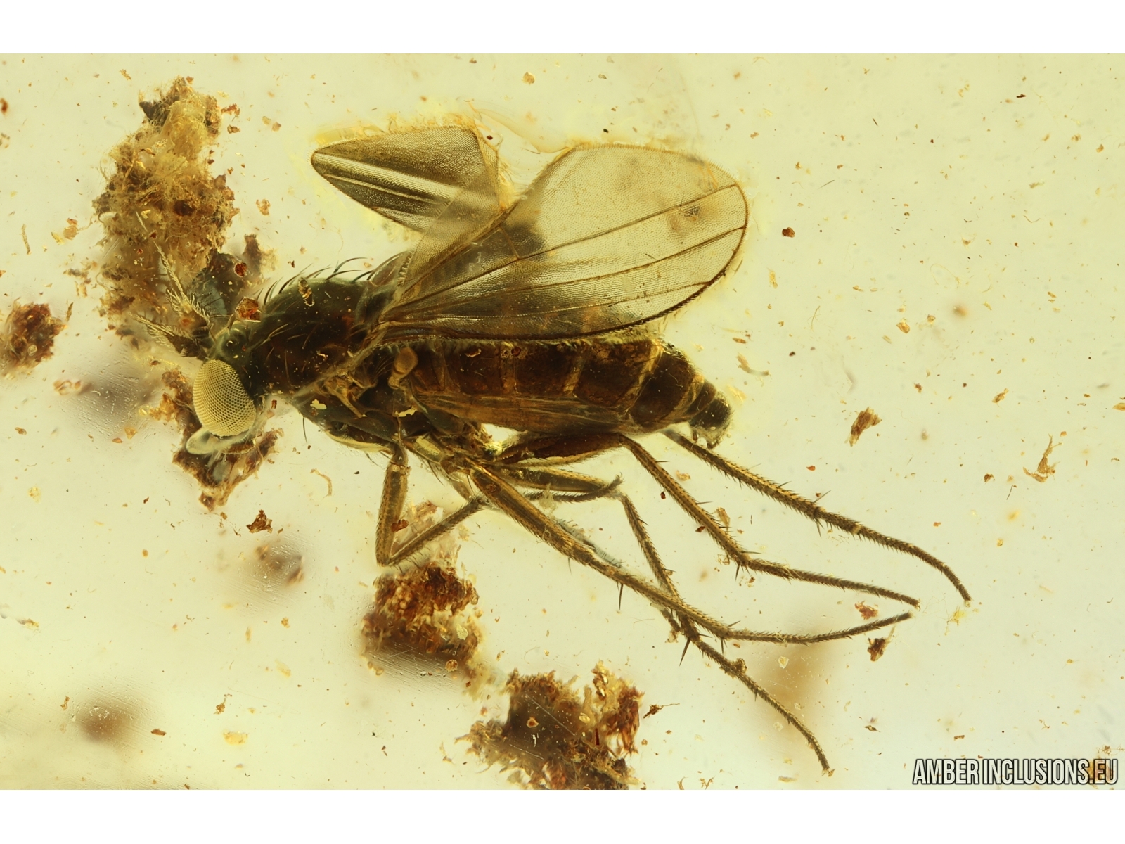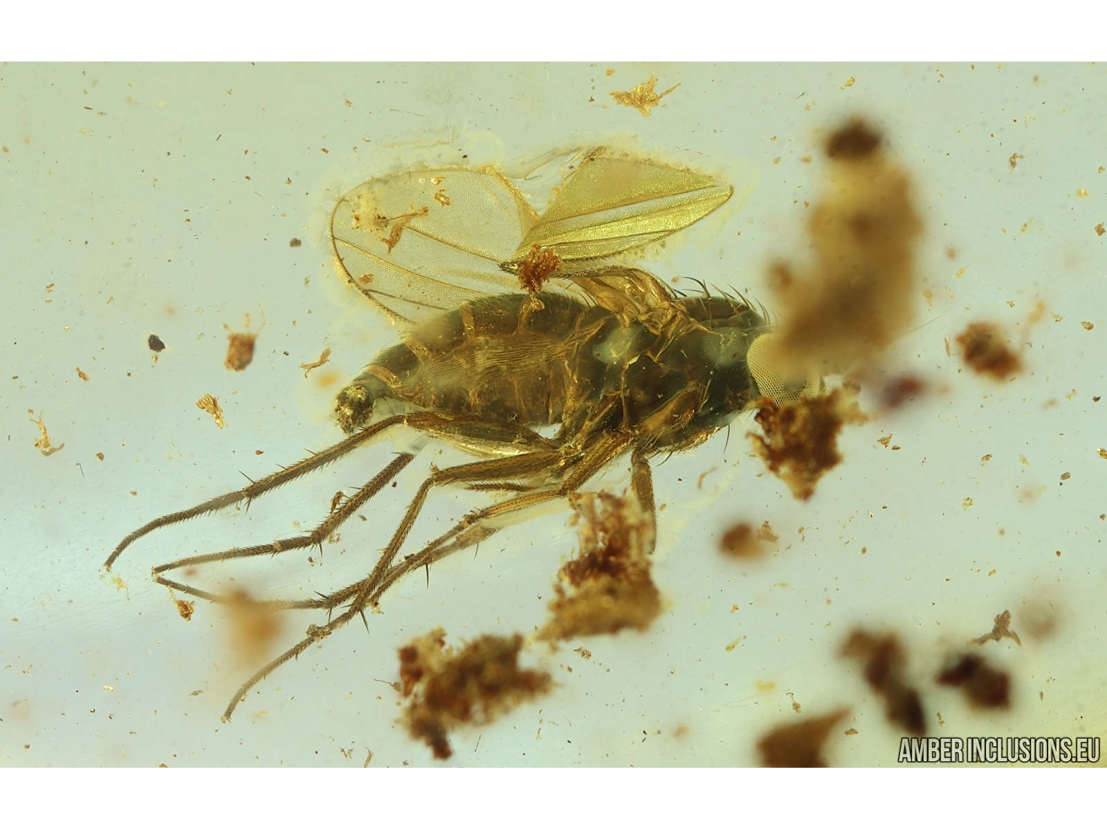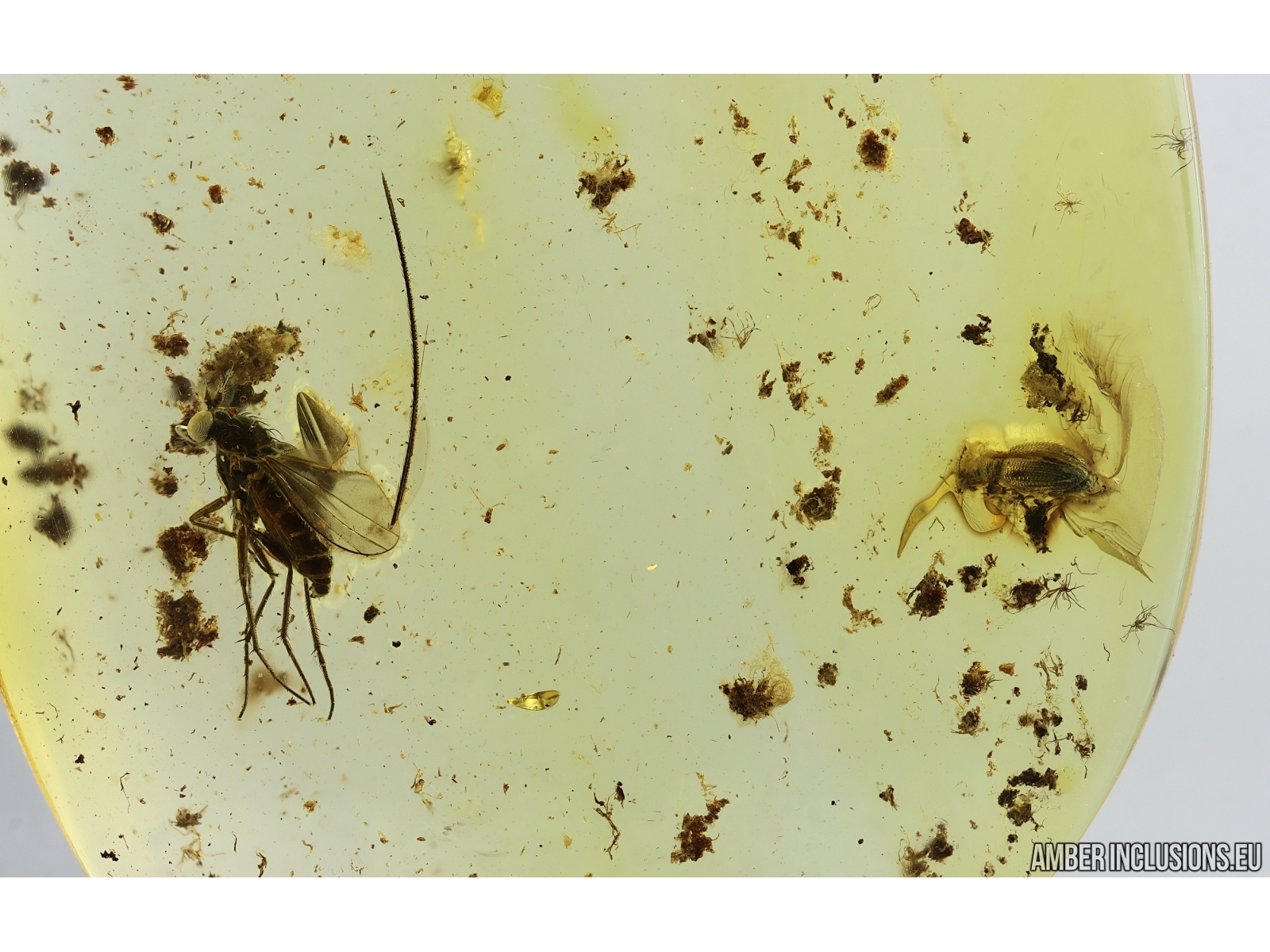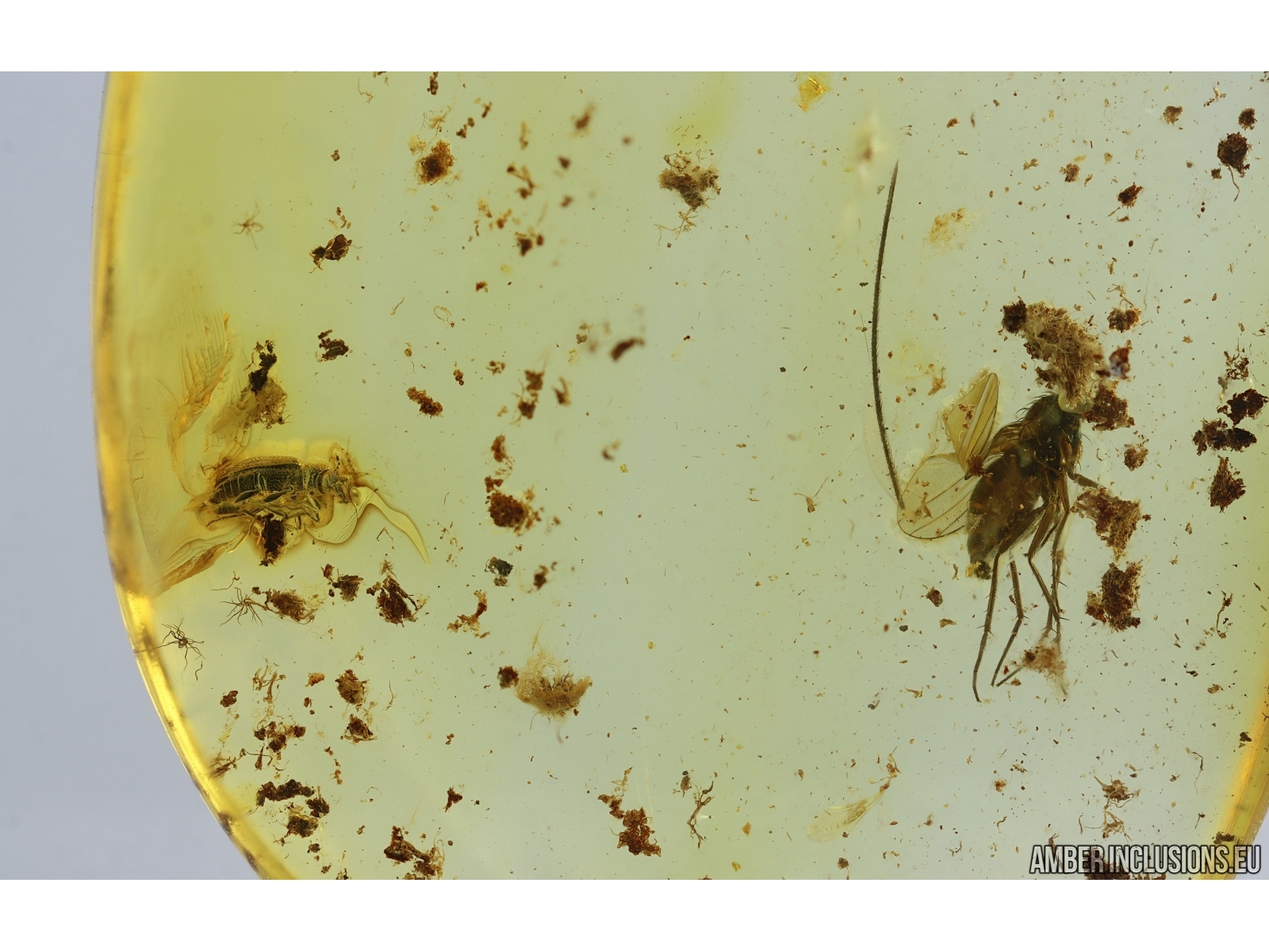 Ukrainian Rovno amber stone with fossil inclusions, trapped 34-56 million years ago -Brown scavenger beetle Latridiidae and Long-legged fly Dolichopodidae.