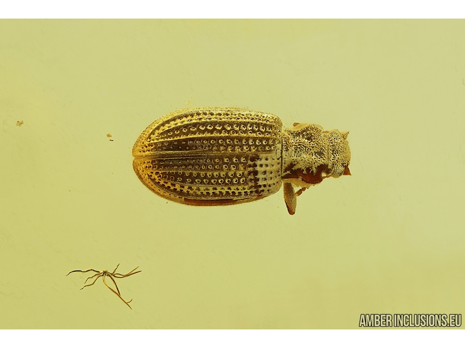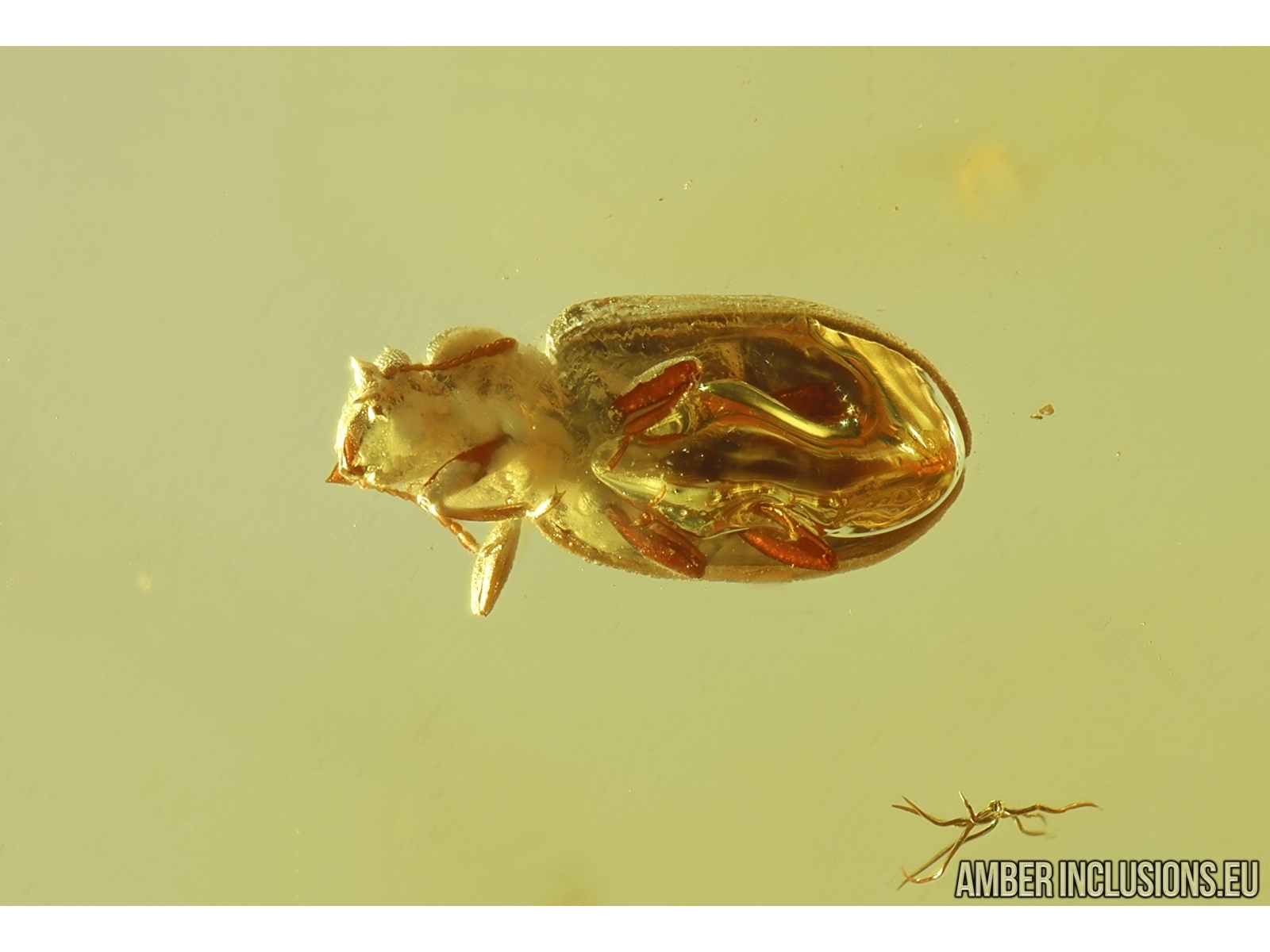 It weighs 1.9 g. Measurements of stone 29x17x7mm, length of beetle ~1.7mm.