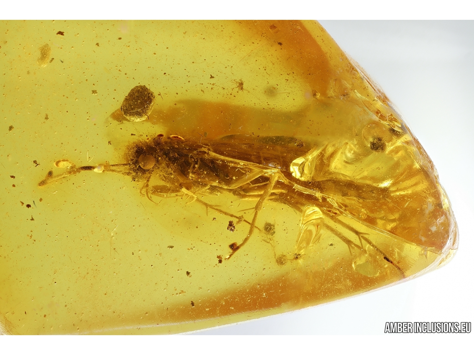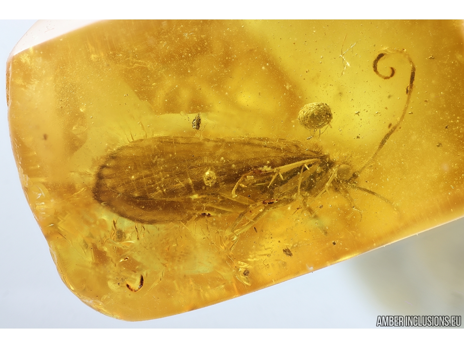 Ukrainian Rovno amber stone with fossil inclusions, trapped 34-56 million years ago -Caddisfly Trichoptera and Coprolite.