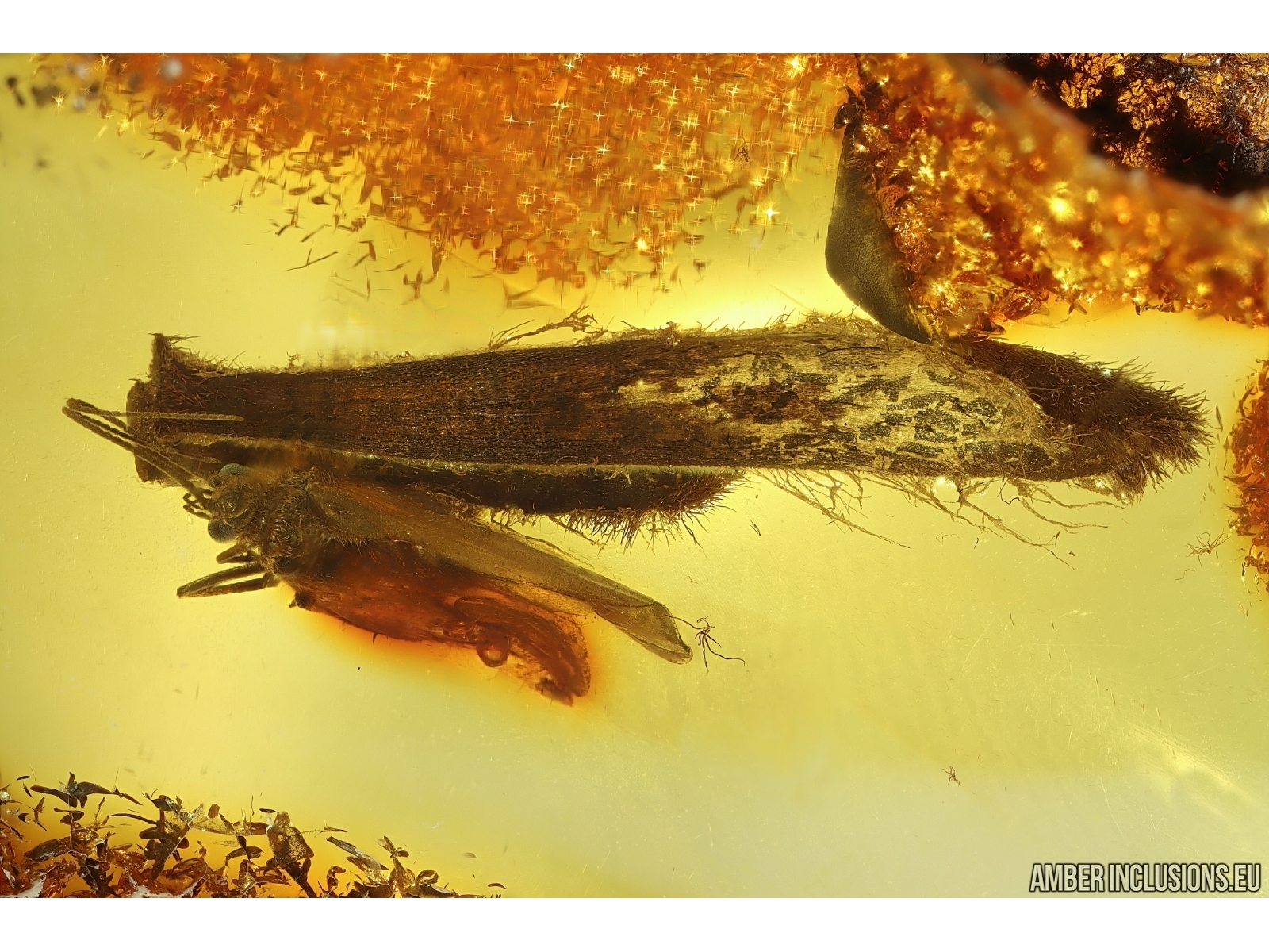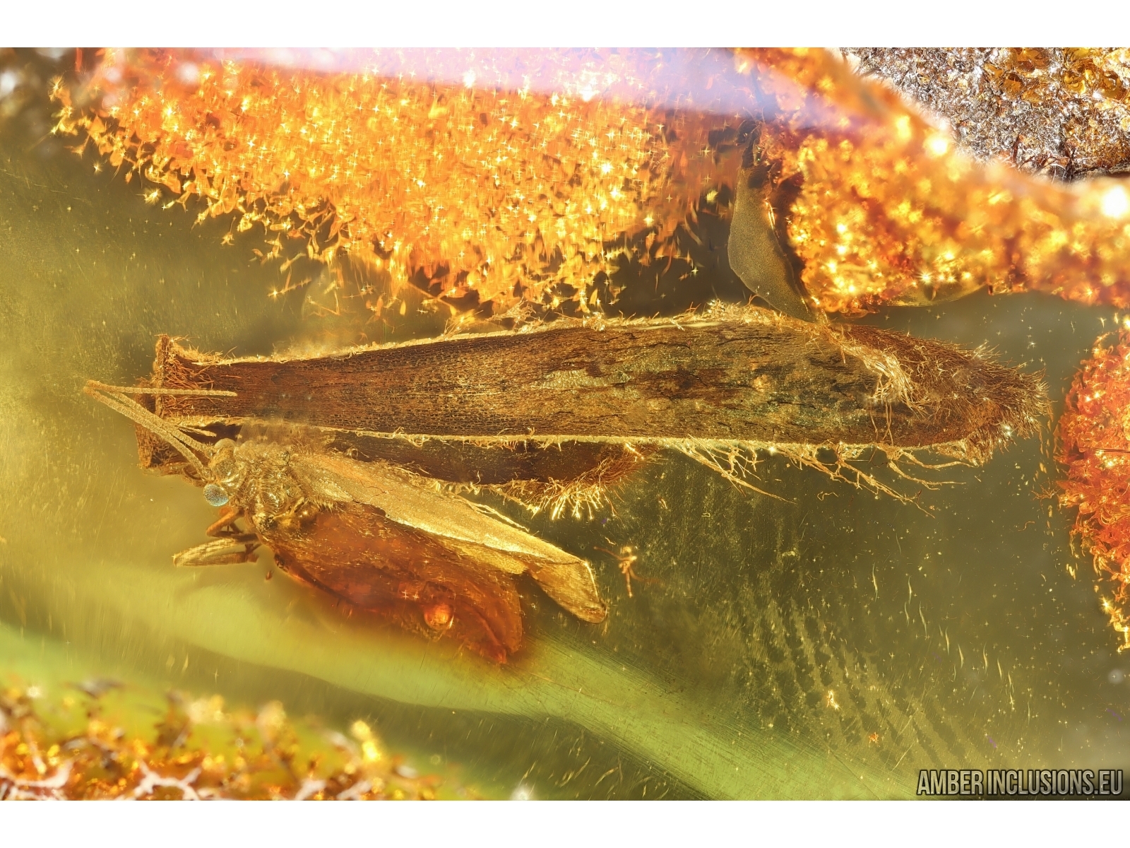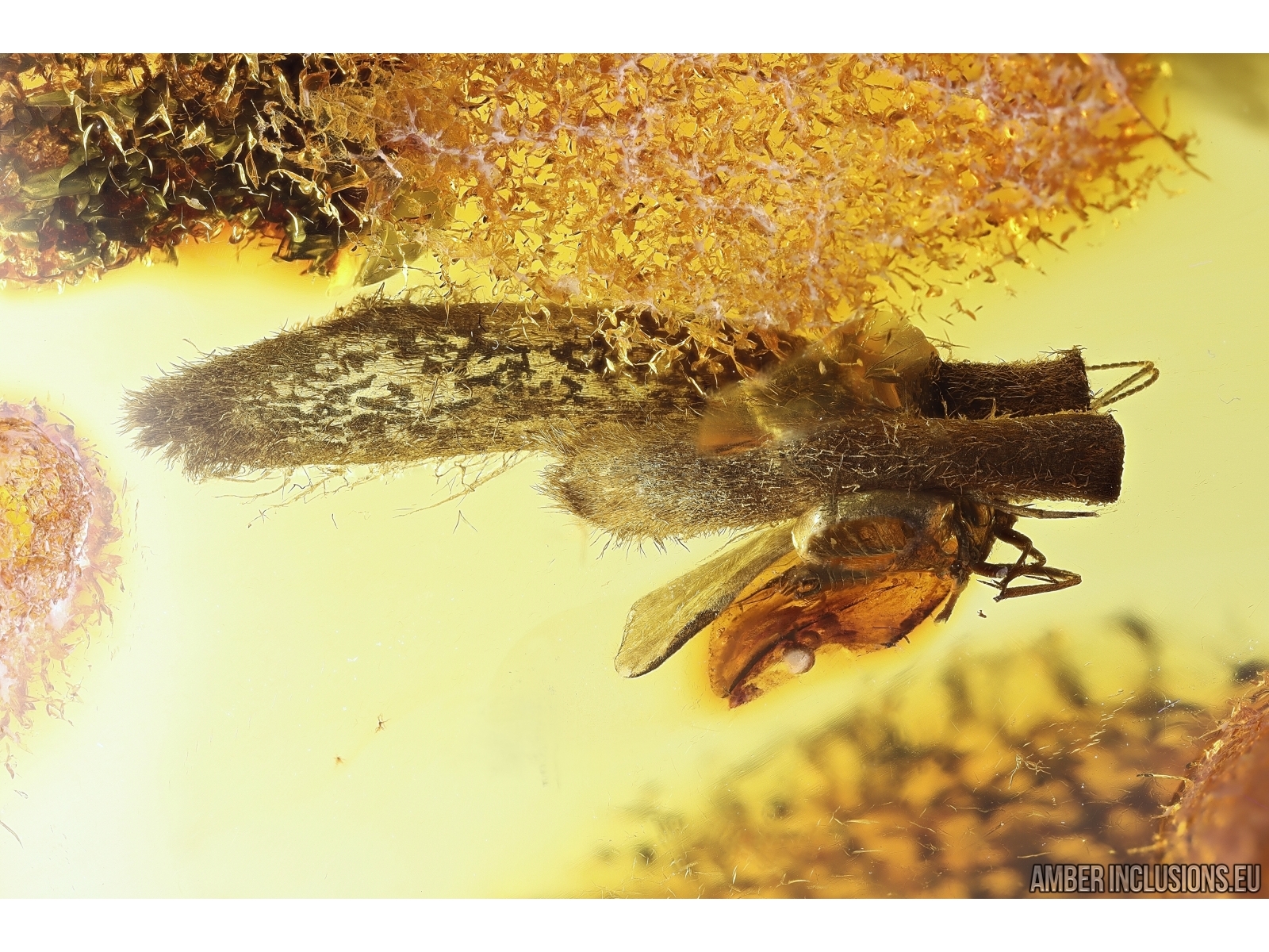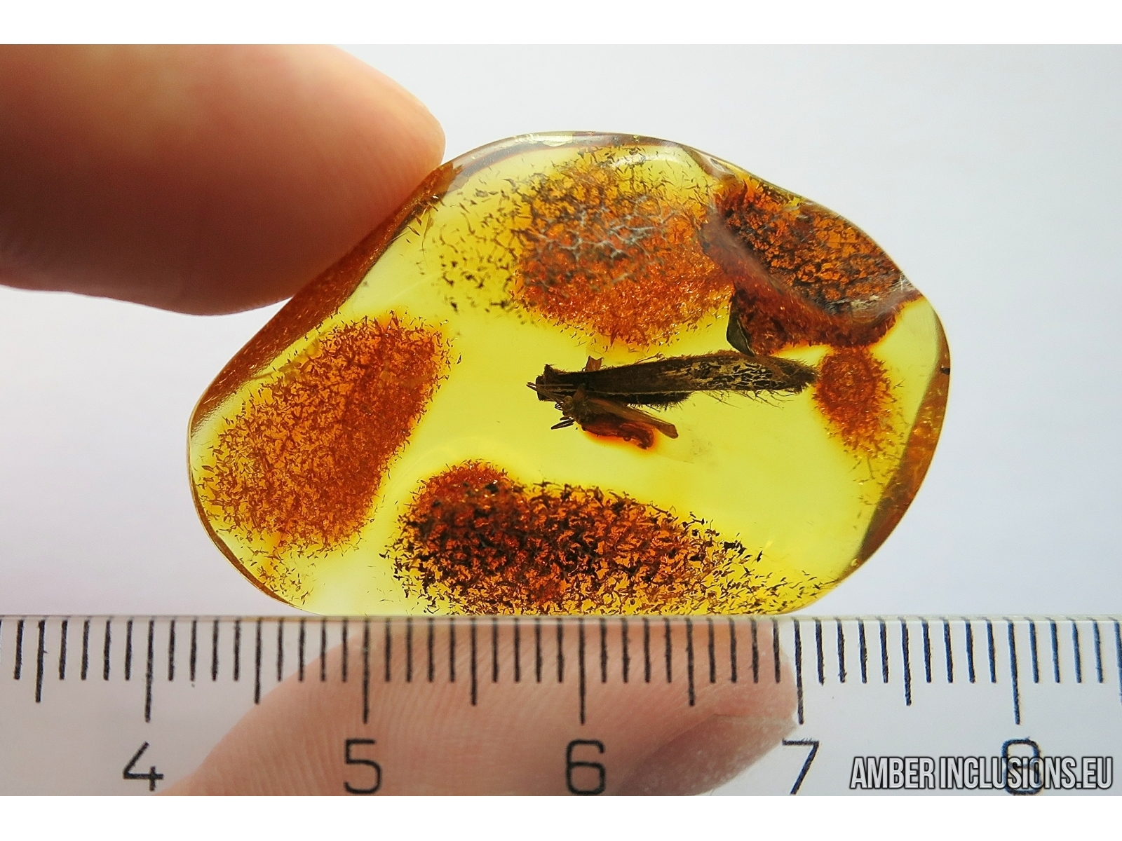 Baltic amber stone with fossil inclusions, trapped 34-56 million years ago - Caddisfly Trichoptera and Leaf.
