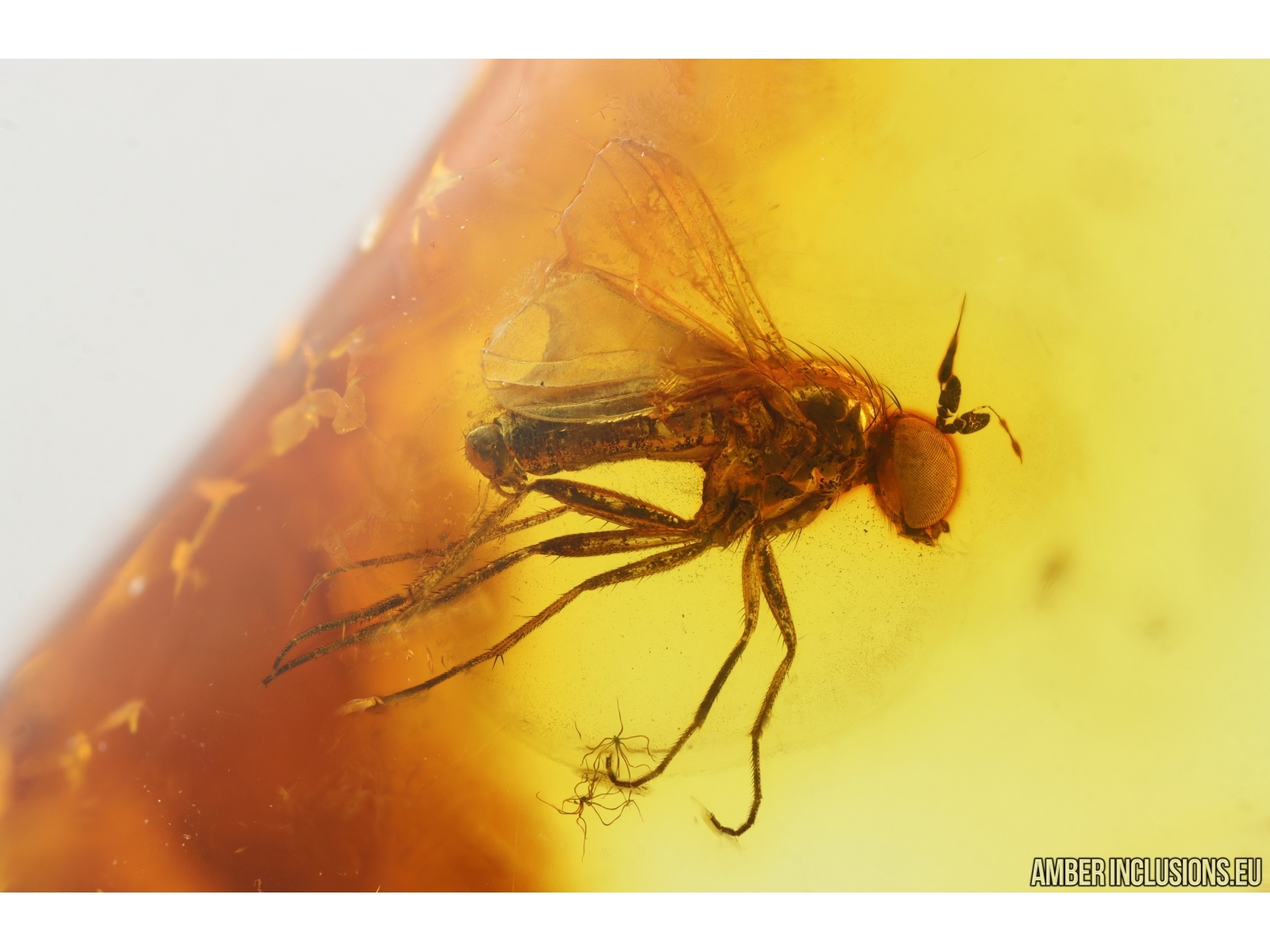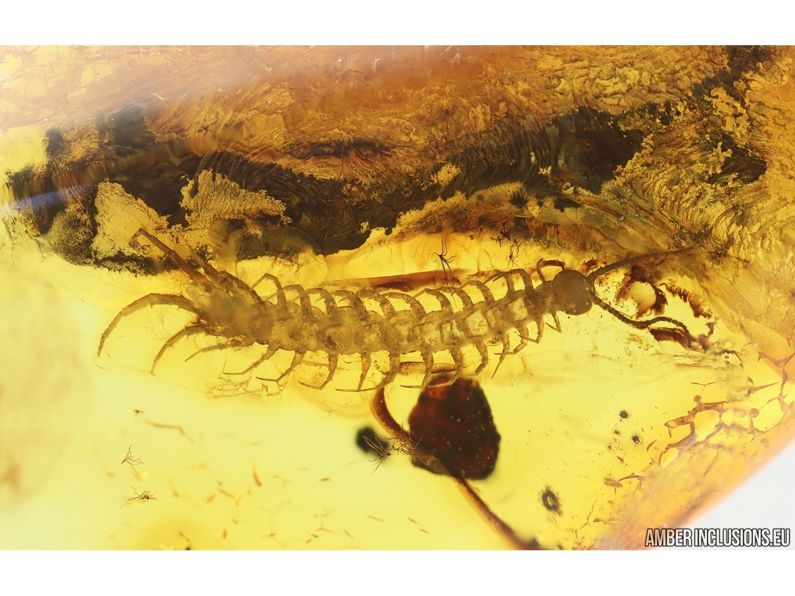 Baltic amber stone with fossil inclusions, trapped 34-56 million years ago - Centipede Lithobiidae and Long-legged fly Dolichopodidae.