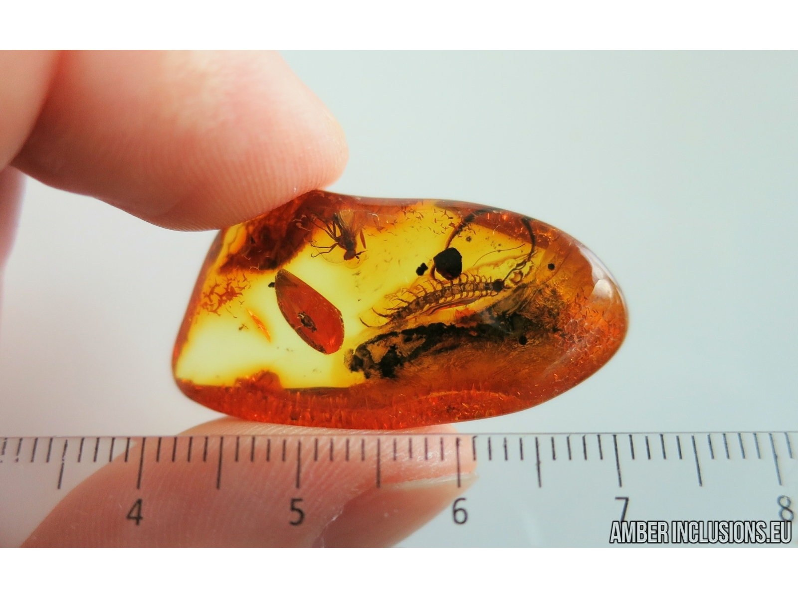 It weighs 3 g. Measurements of stone 35x18x9mm, length of centipede ~9mm, fly ~3.5mm.