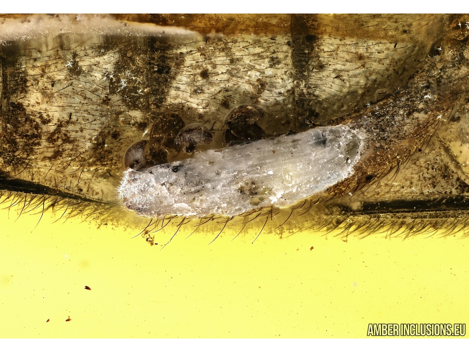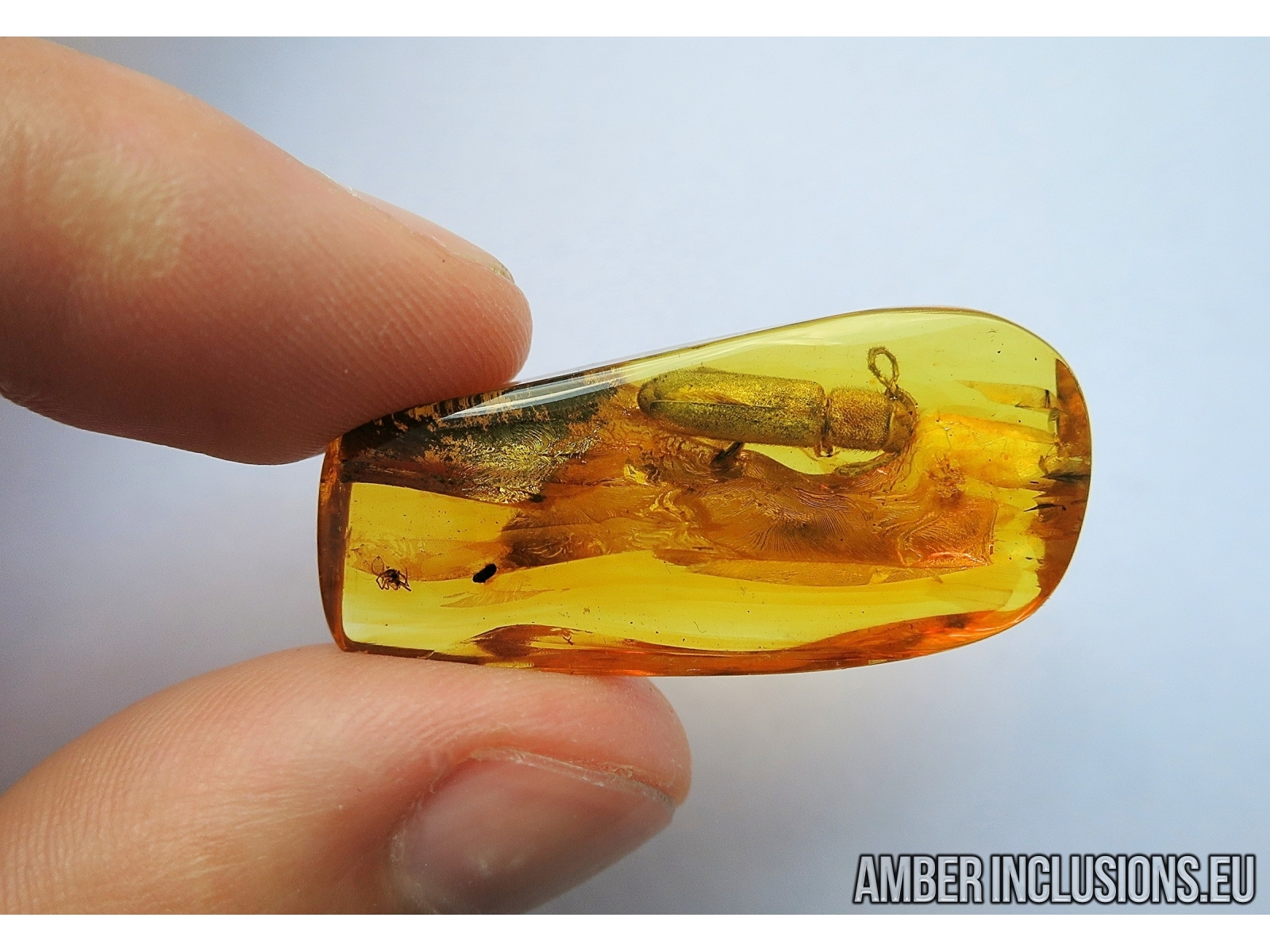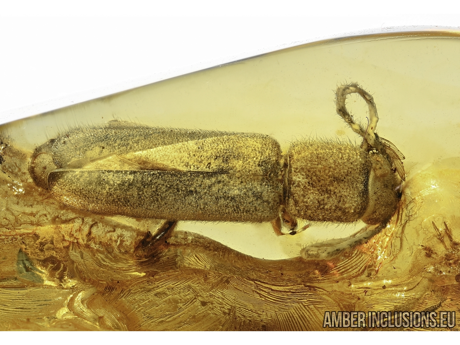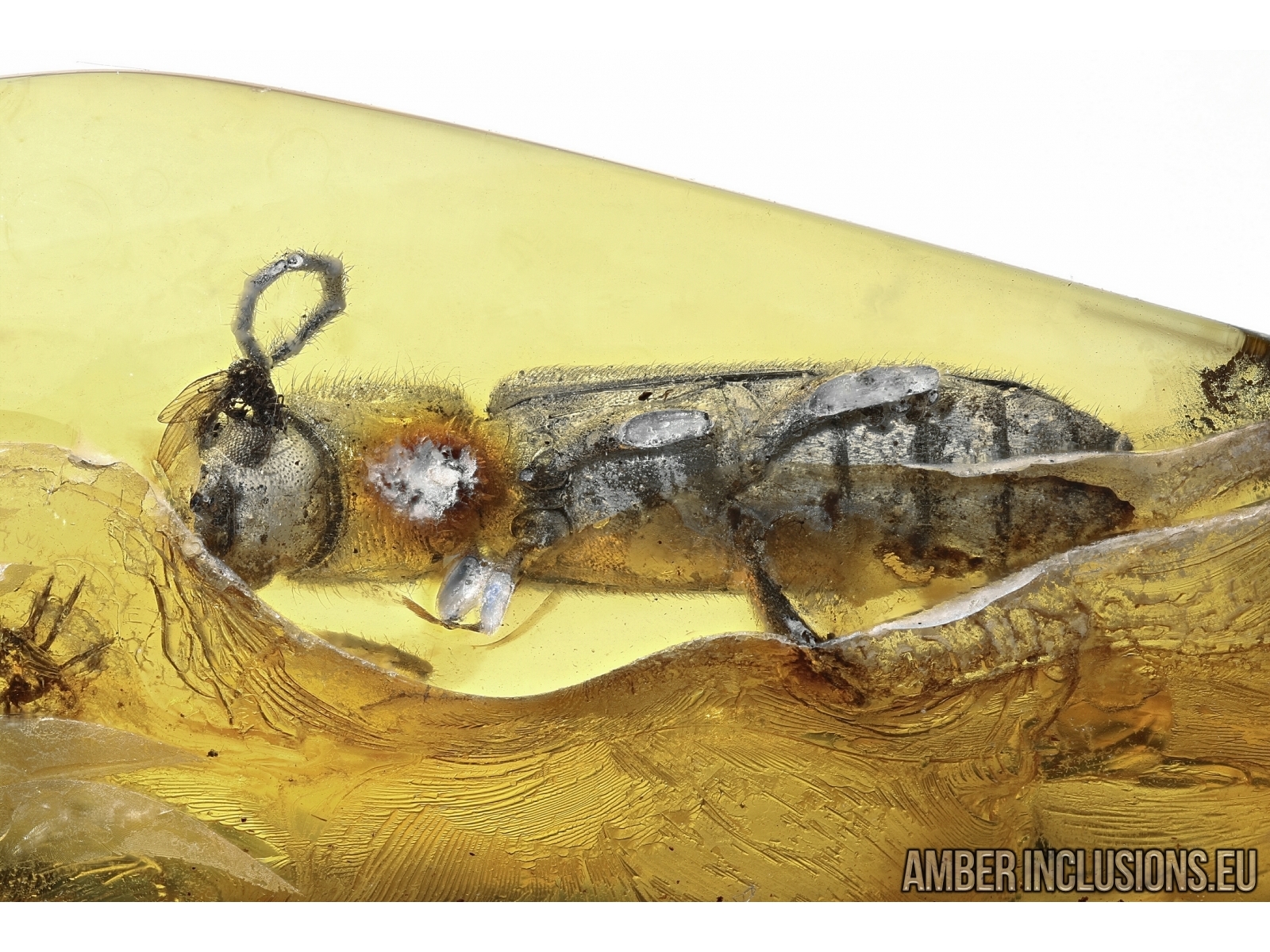 Baltic amber stone with fossil insect - Cerambycidae, Beetle (legs cuted) and Tortoise mites ( Acari, Uropodidae) on a beetle.