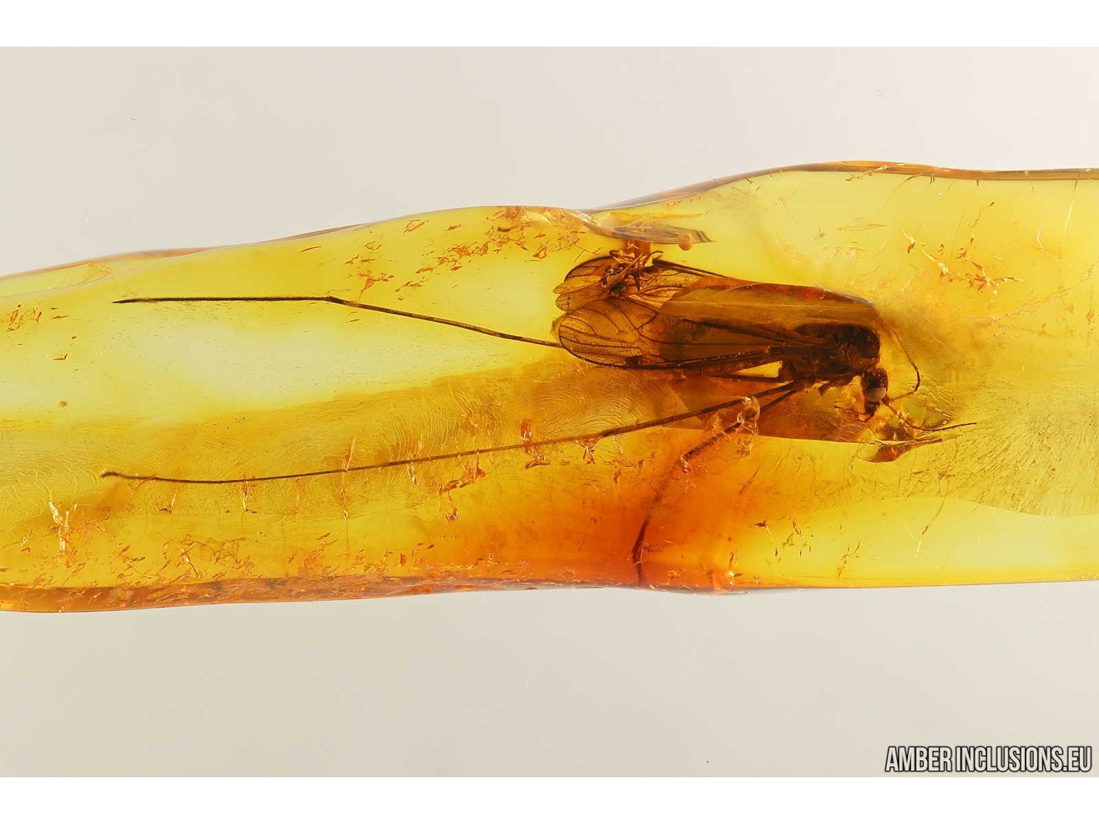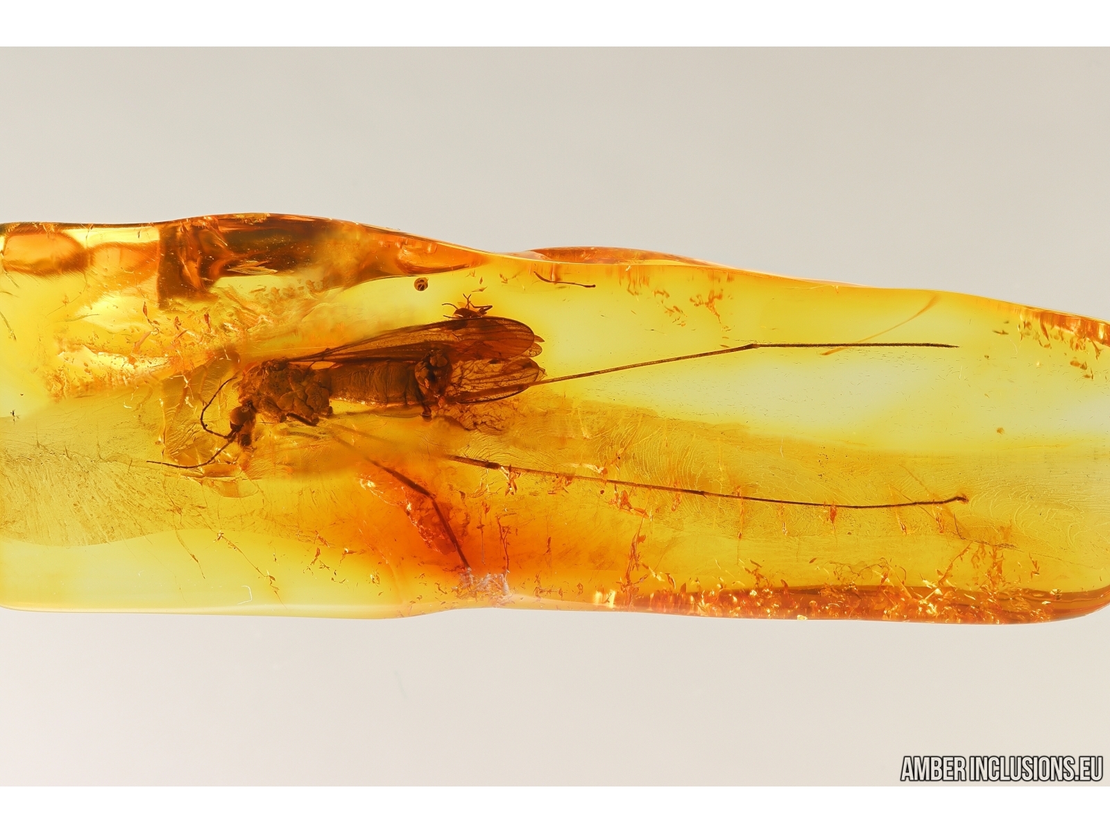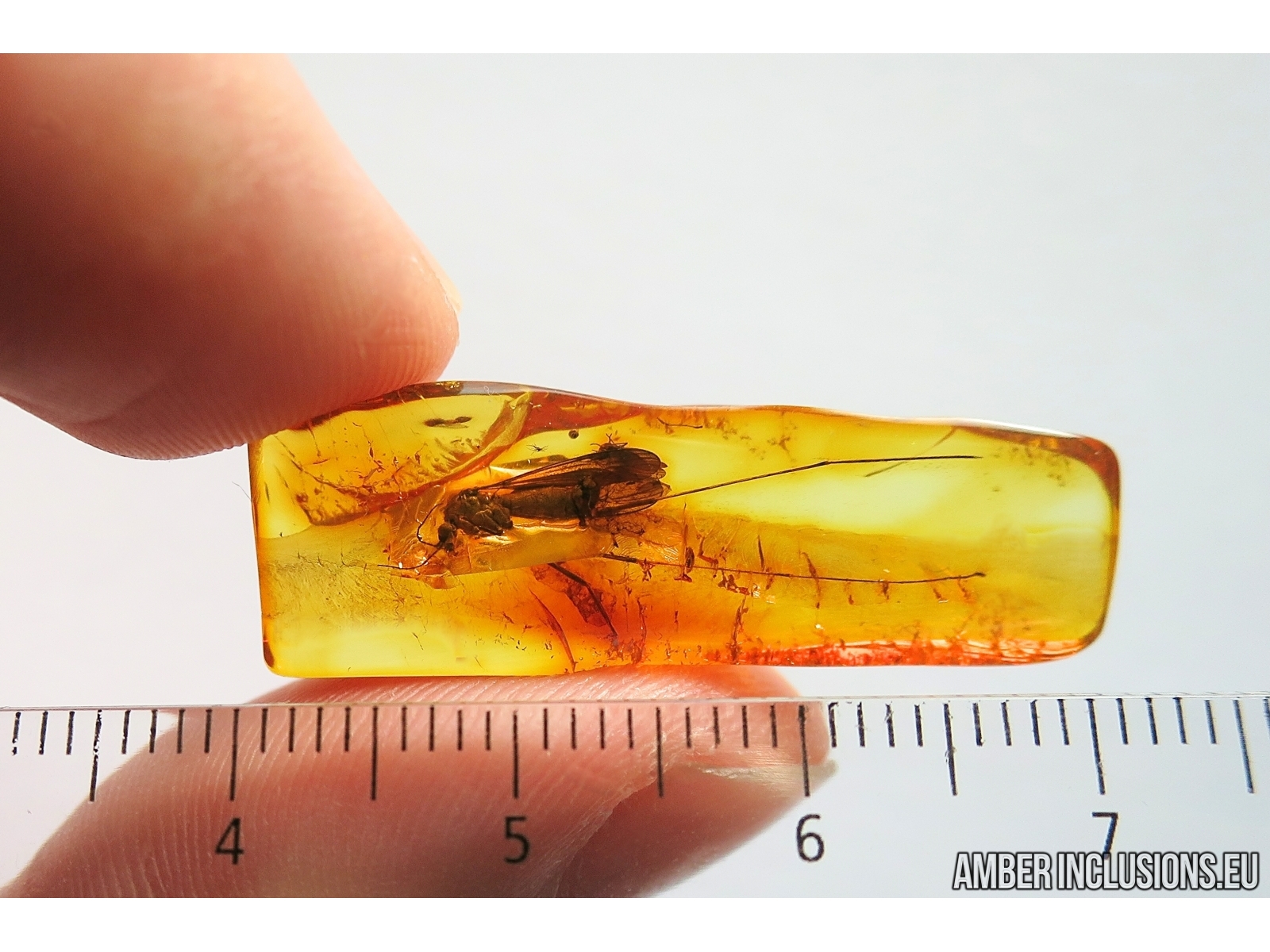 It weighs 1.4 g. Measurements of stone 33x11x5mm, length of crane fly body~7mm, max ~20mm.