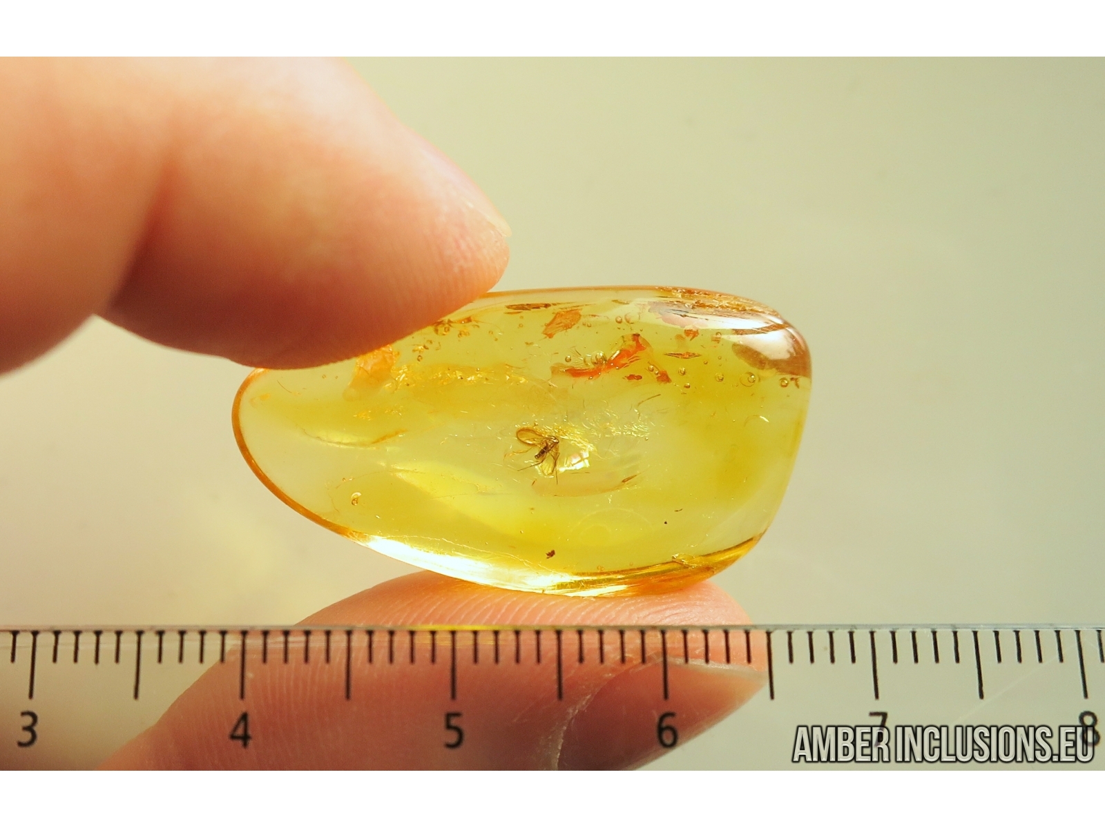 It weighs 2.6 g. Measurements of stone 32x16x8mm, length of gnat ~1.7mm.