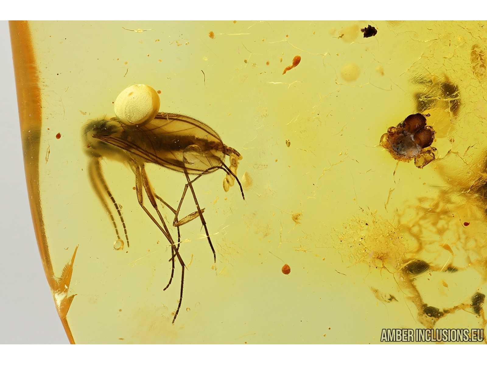 Baltic amber stone with fossil inclusion, trapped 34-56 million years ago - Dark-Winged fungus gnat Sciaridae with Eggs.