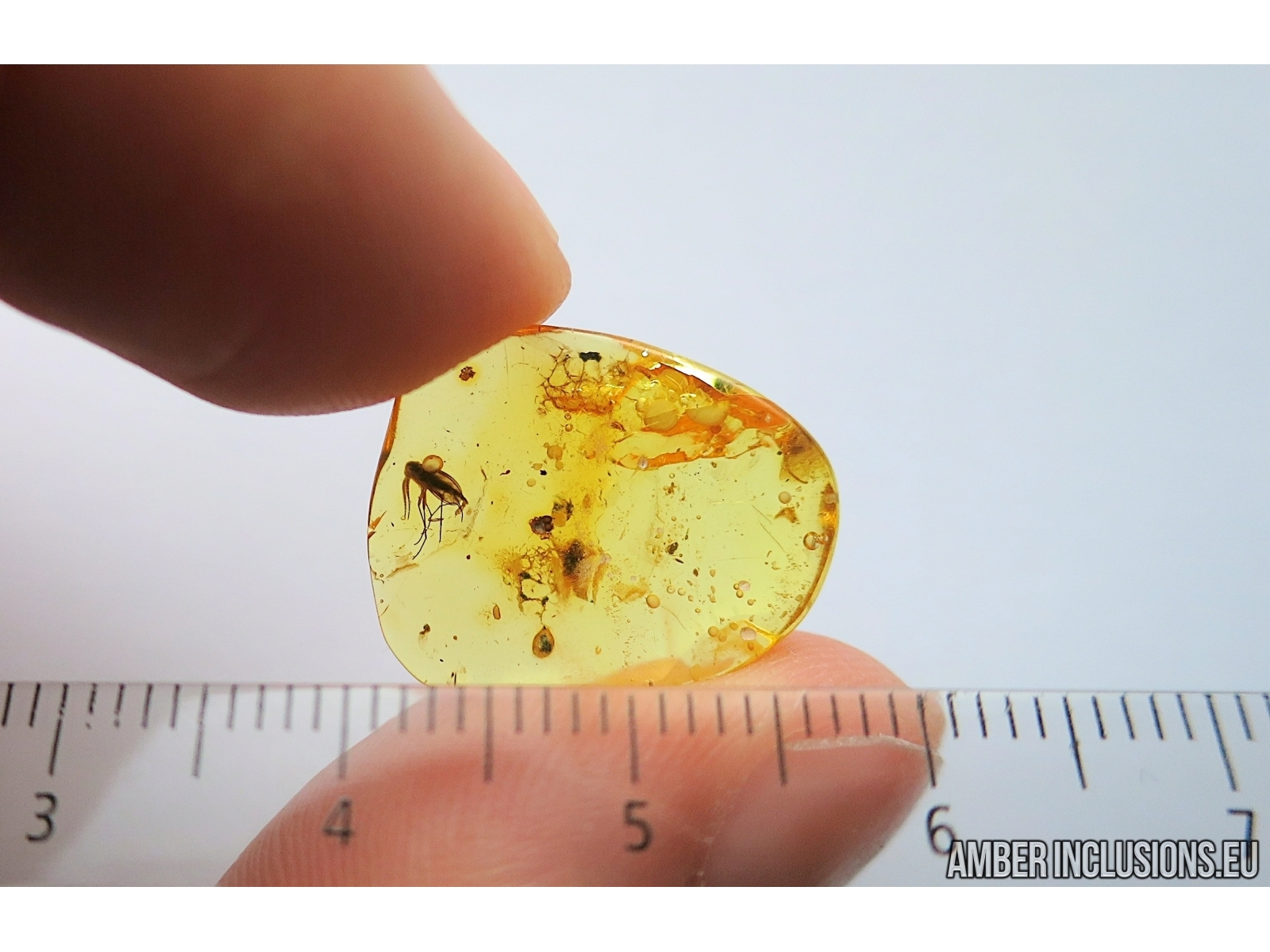 It weighs 0.6 g. Measurements of stone 18x15x3mm, length of gnat ~2mm.