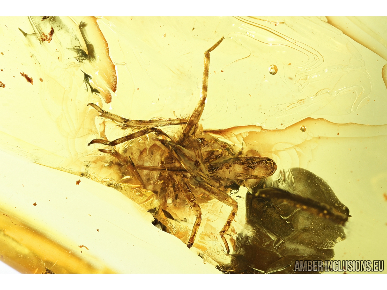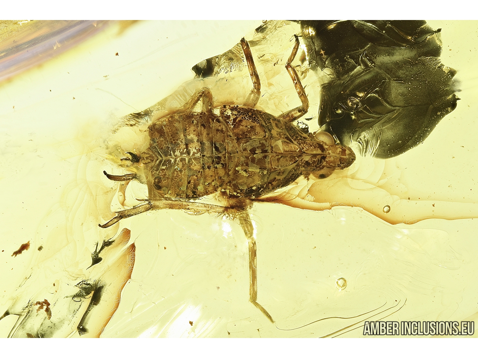 Baltic amber stone with fossil insects- False Flower Beetle and Cicadina.