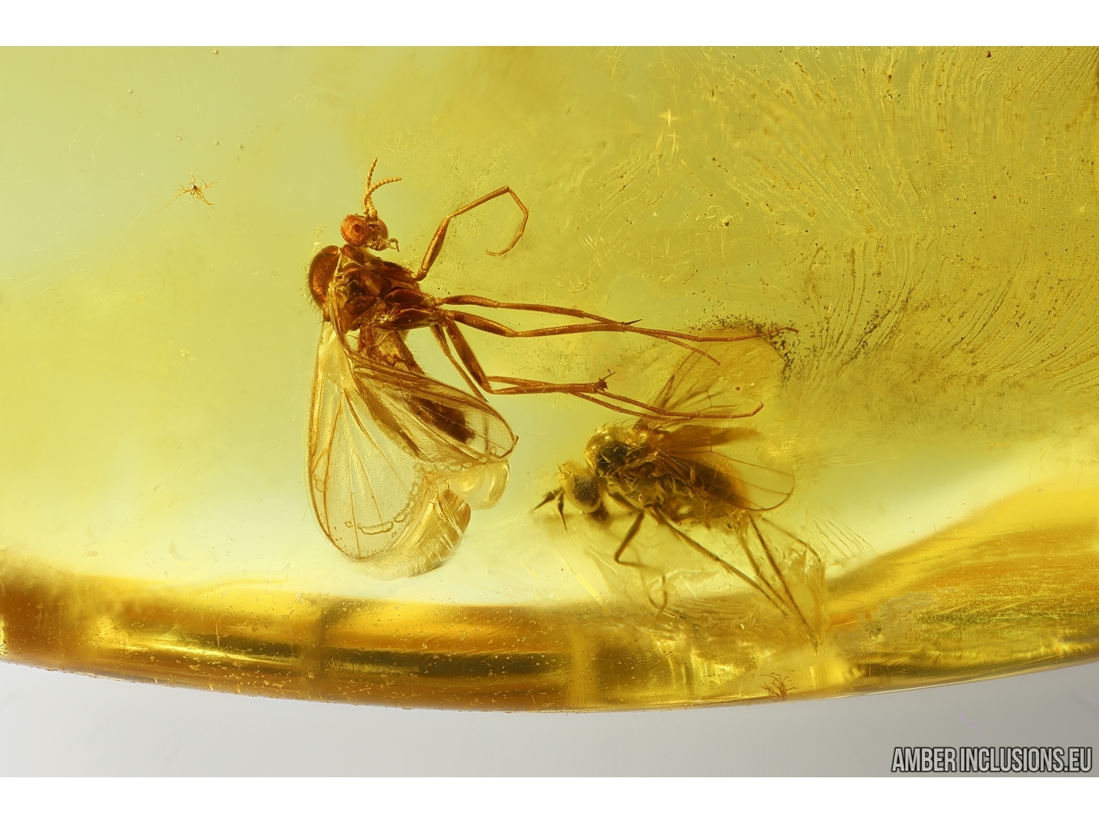 Baltic amber stone with fossil inclusions, trapped 34-56 million years ago - Fungus gnat Keroplatidae and Long-legged fly Dolichopodidae.