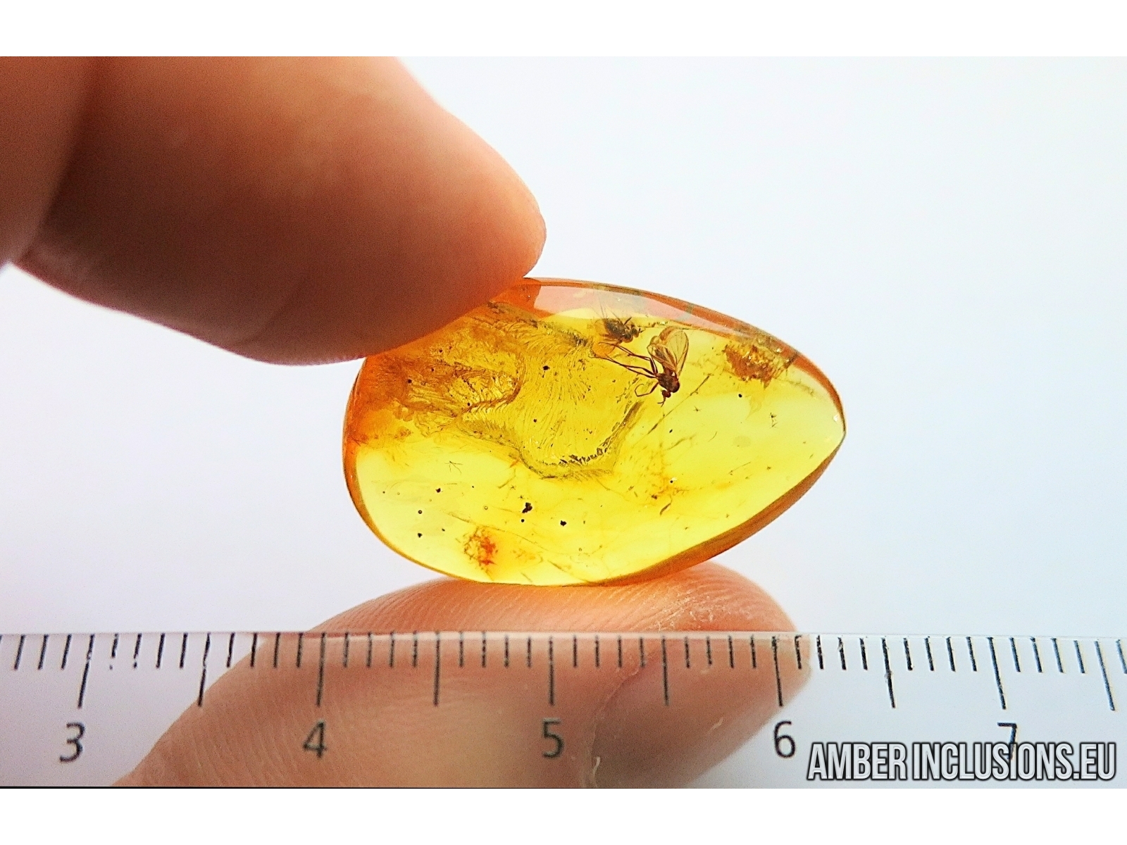 It weighs 1.4 g. Measurements of stone 25x16x6mm, length of gnat ~2.8mm, fly ~1.5mm.
