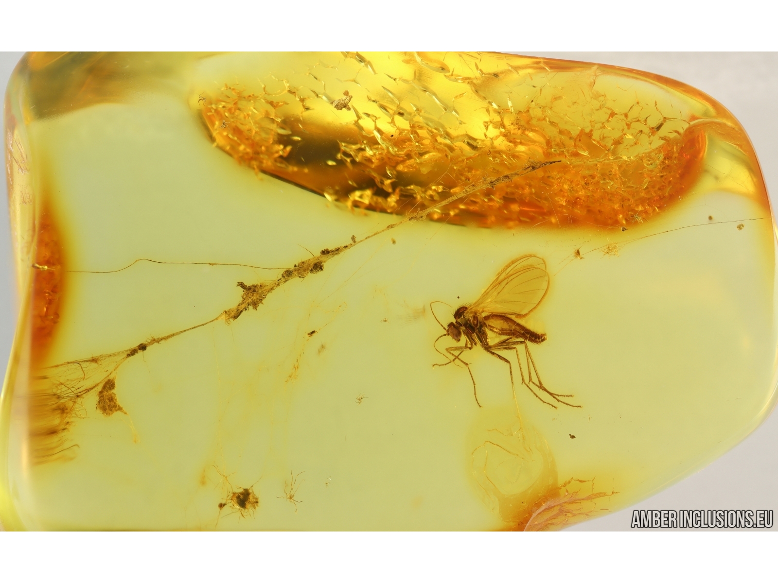 Baltic amber stone with fossil inclusion, trapped 34-56 million years ago - Fungus gnat Keroplatidae in Spider Web