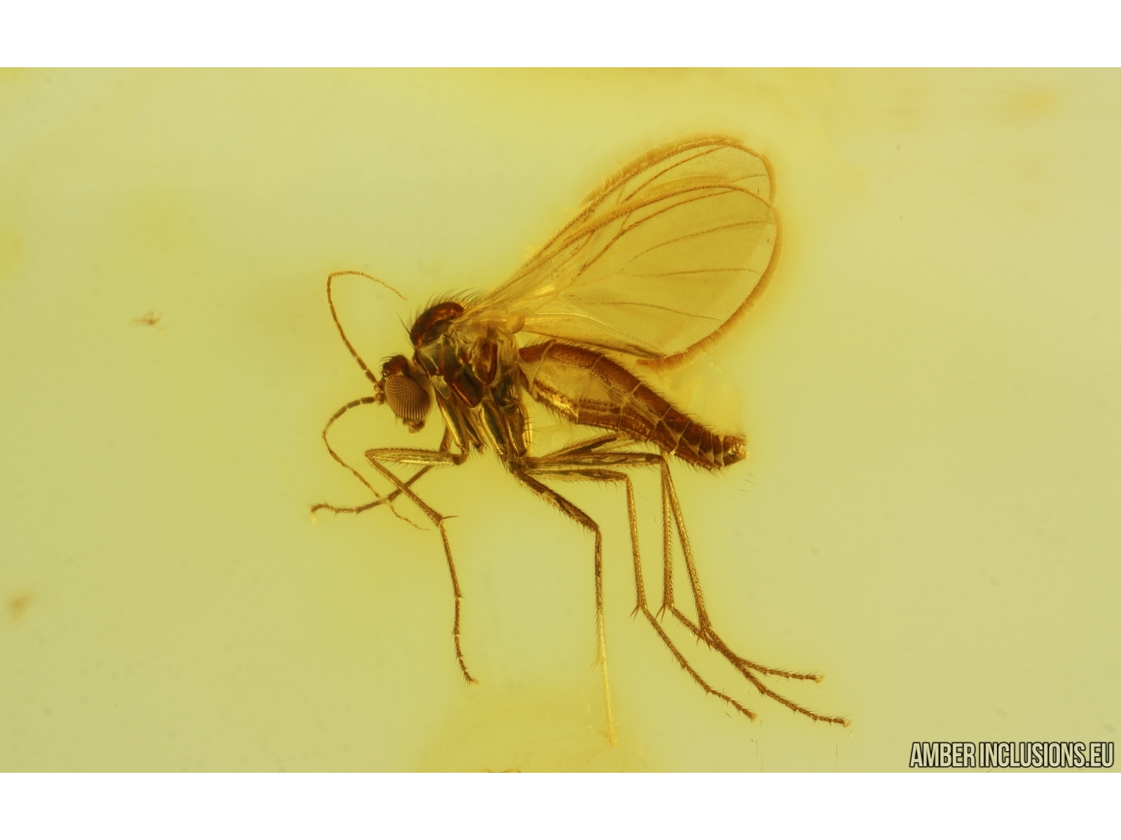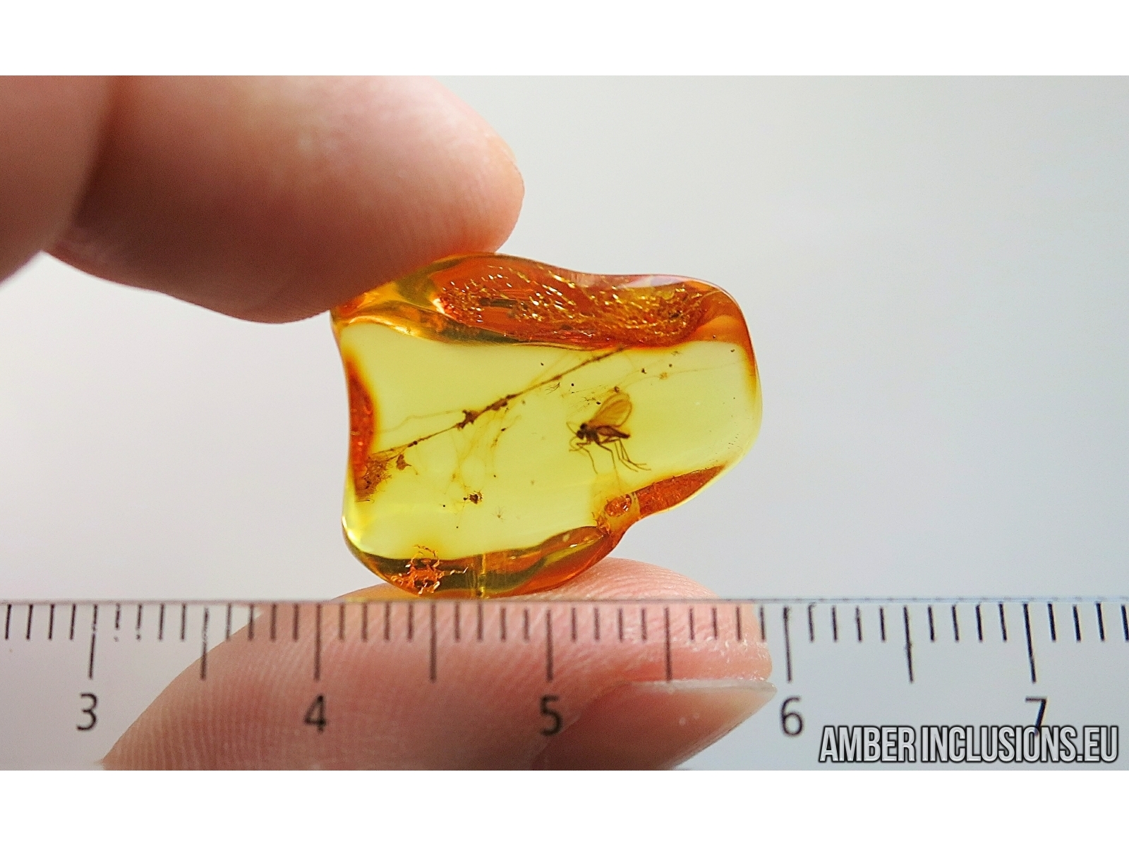 It weighs 2 g. Measurements of stone 20x17x10mm, length of gnat ~2.7mm, web ~17mm.