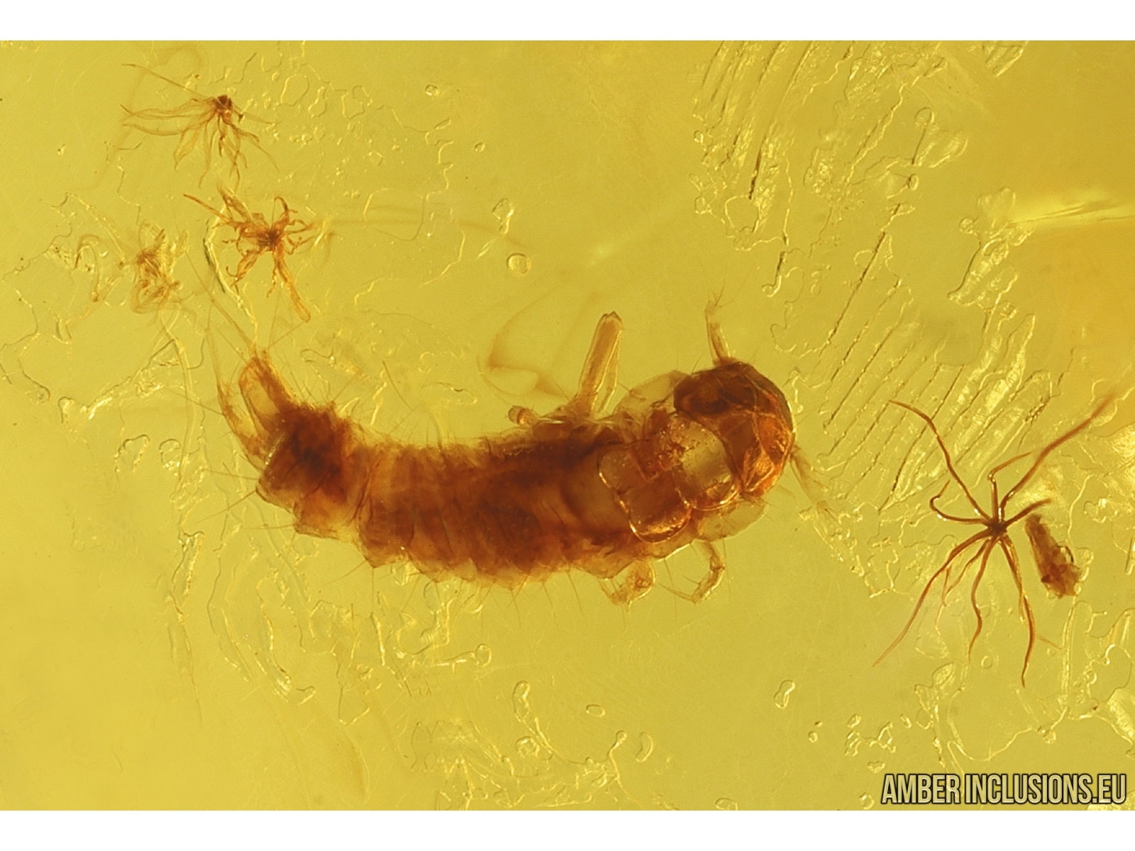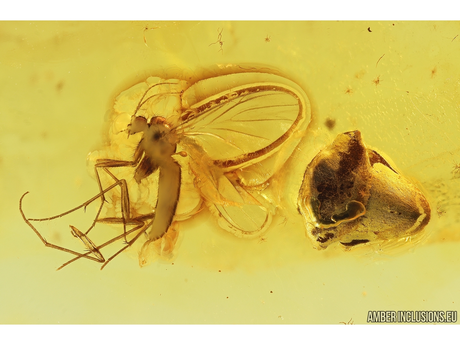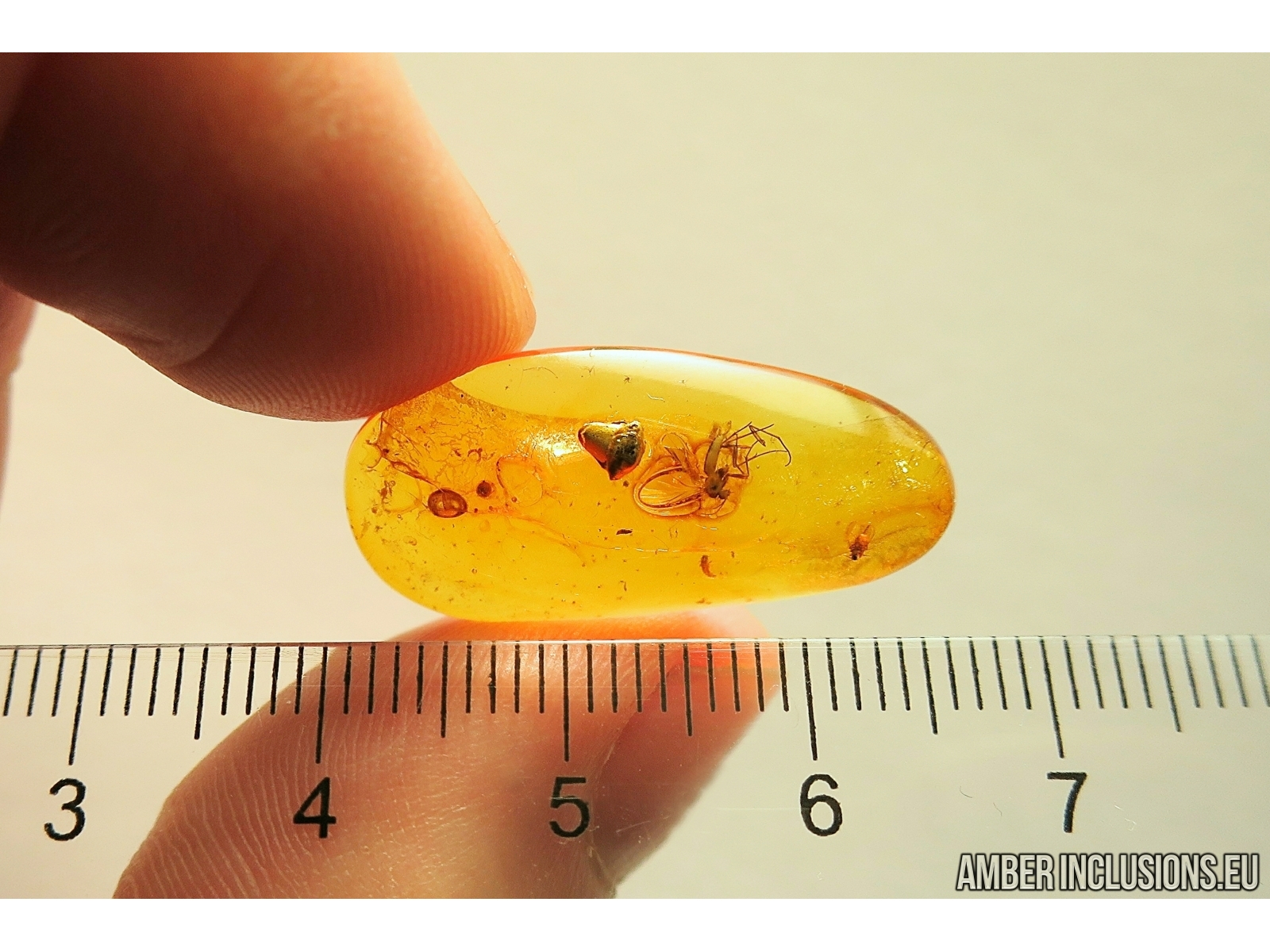 Baltic amber stone with fossil inclusion, trapped 34-56 million years ago - Fungus gnat Keroplatidae, Plant and Beetle Larva.