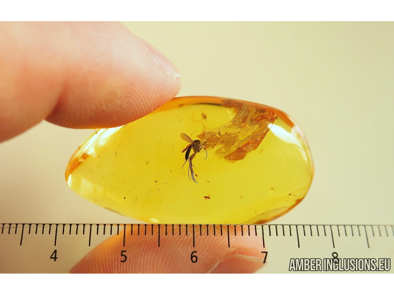 It weighs 6.5 g. Measurements of stone 40x23x12mm, length of gnat body~3.2mm, max ~7mm.
