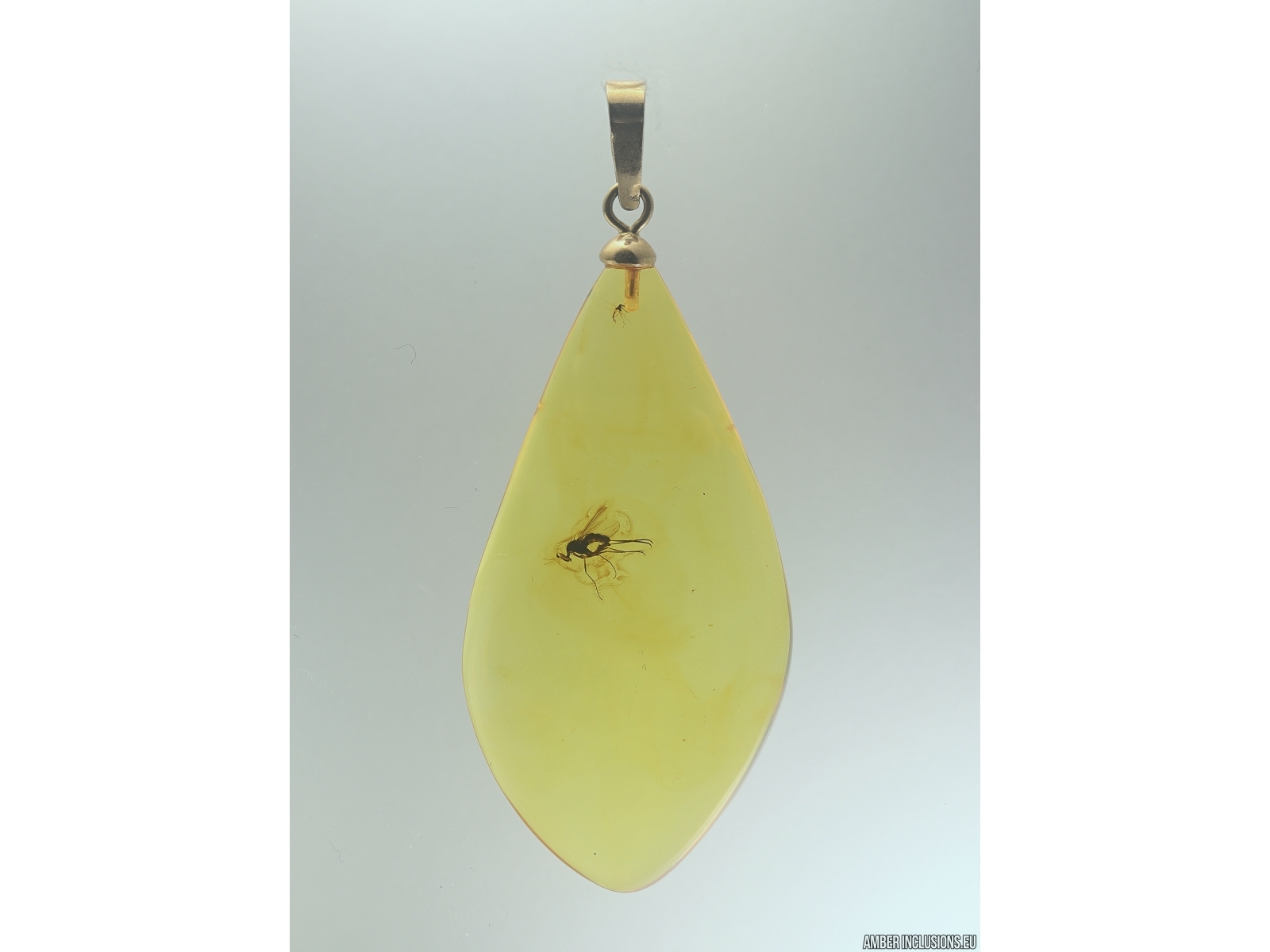 Genuine Baltic amber golden pendant 14K. with fossil insect - Long-legged fly Dolichopodidae.