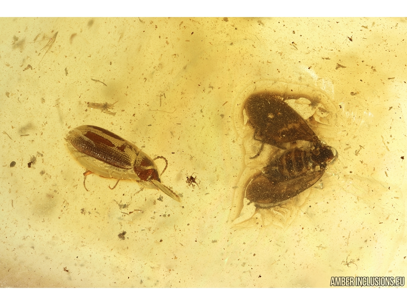 Big Baltic amber stone with fossil inclusions, trapped 34-56 million years ago - Hairy fungus beetle Mycetophagidae and Gnat.