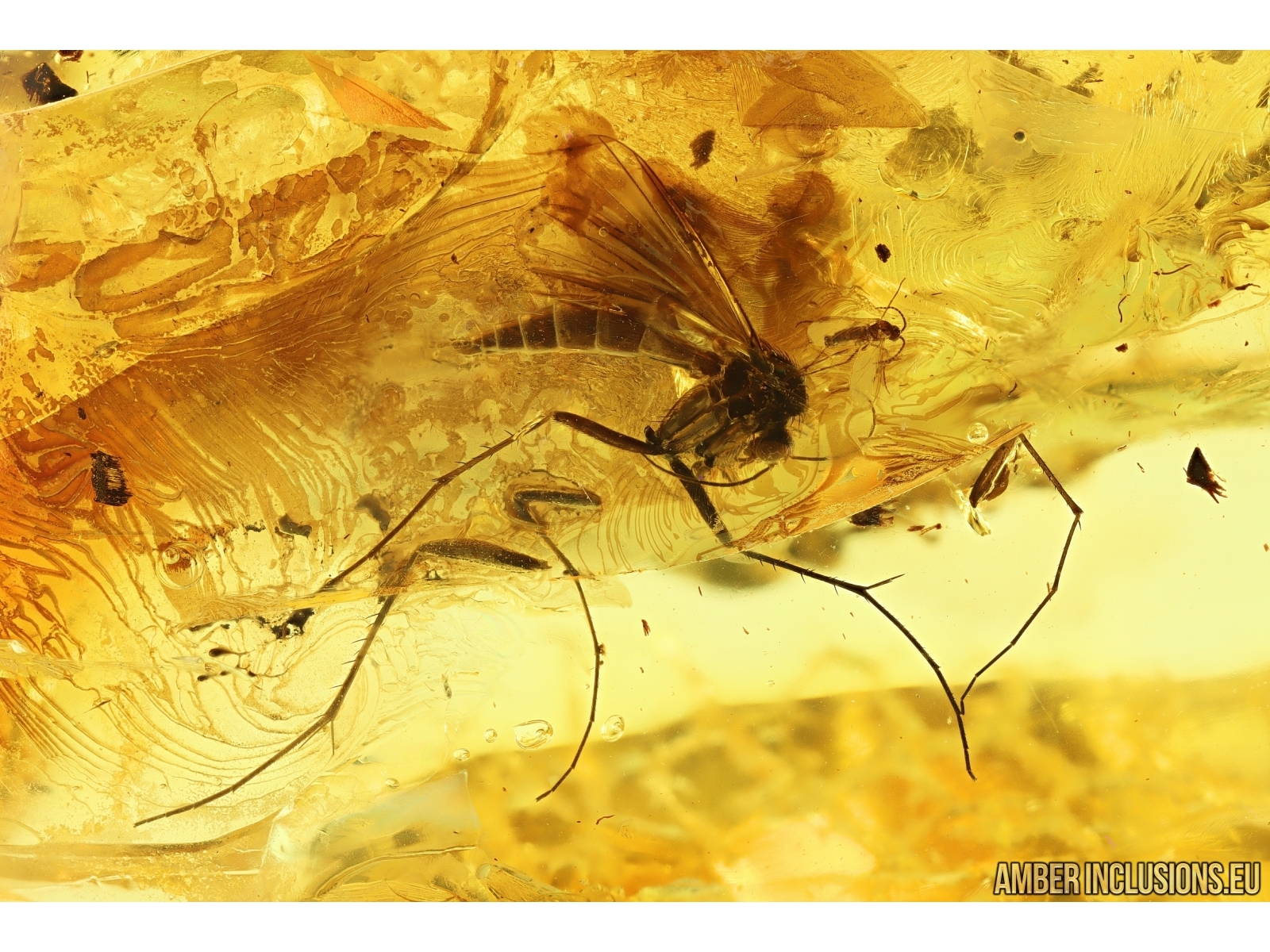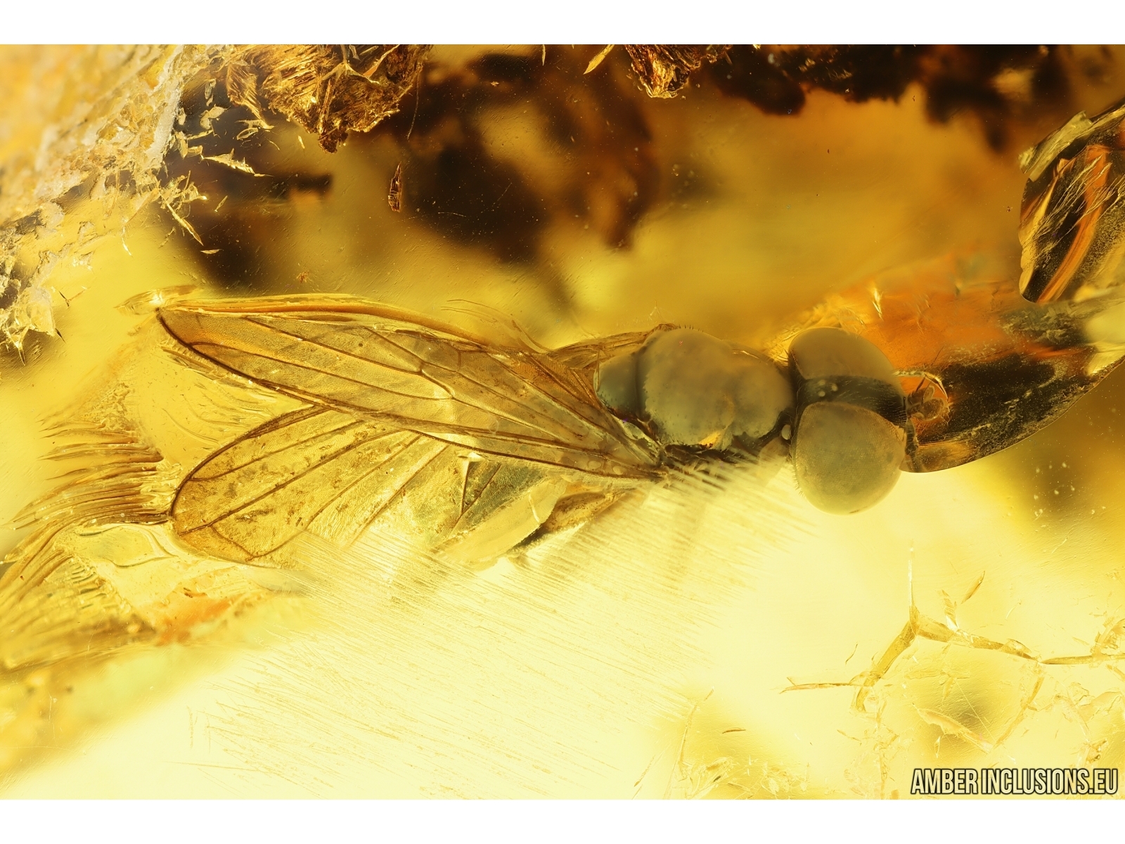 Ukrainian Rovno amber stone with fossil inclusions, trapped 34-56 million years ago - Hover Fly Syrphidae and Fungus gnat Mycetophilidae.