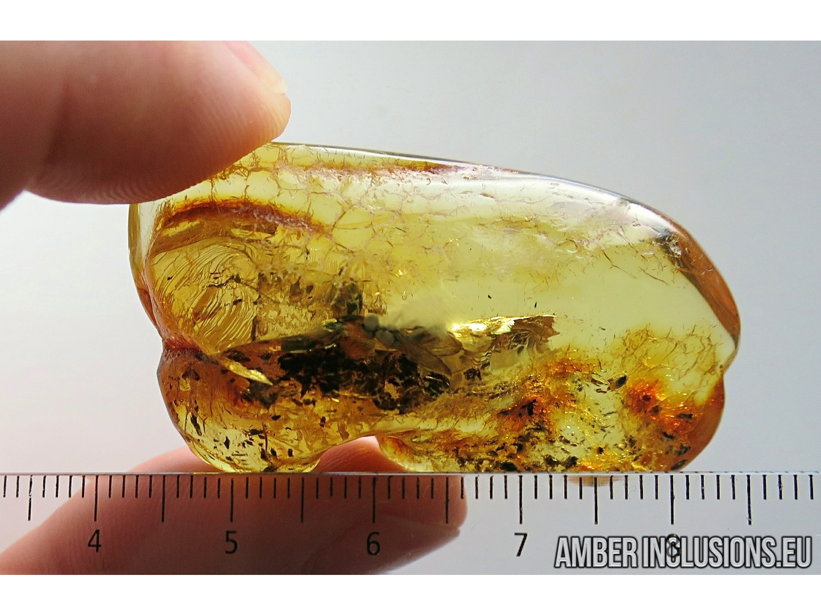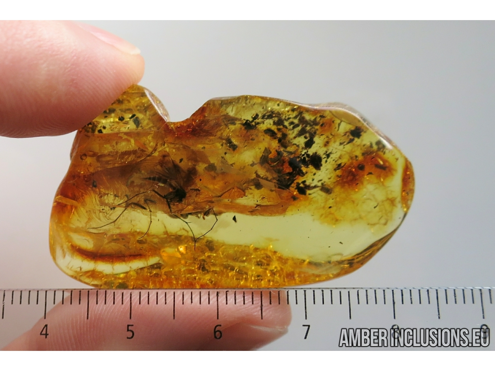 It weighs 9 g. Measurements of stone 46x25x13mm, length of fly ~5.5mm, gnat ~4mm.