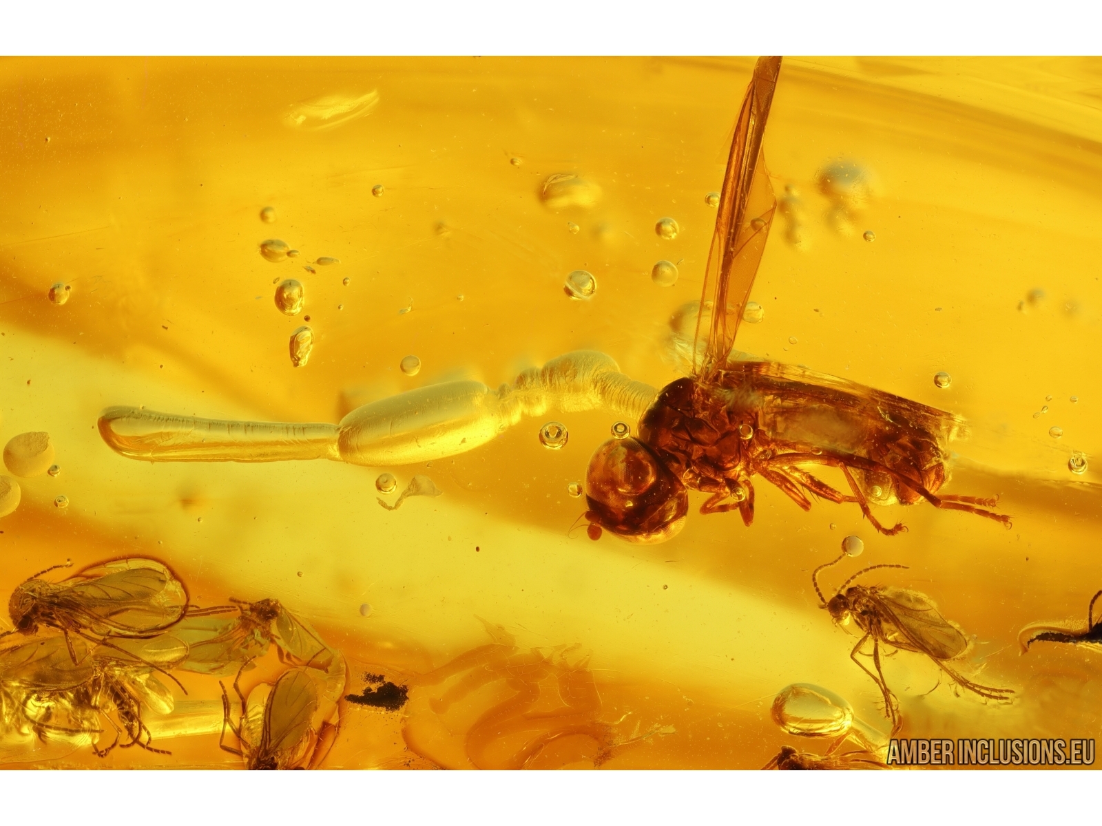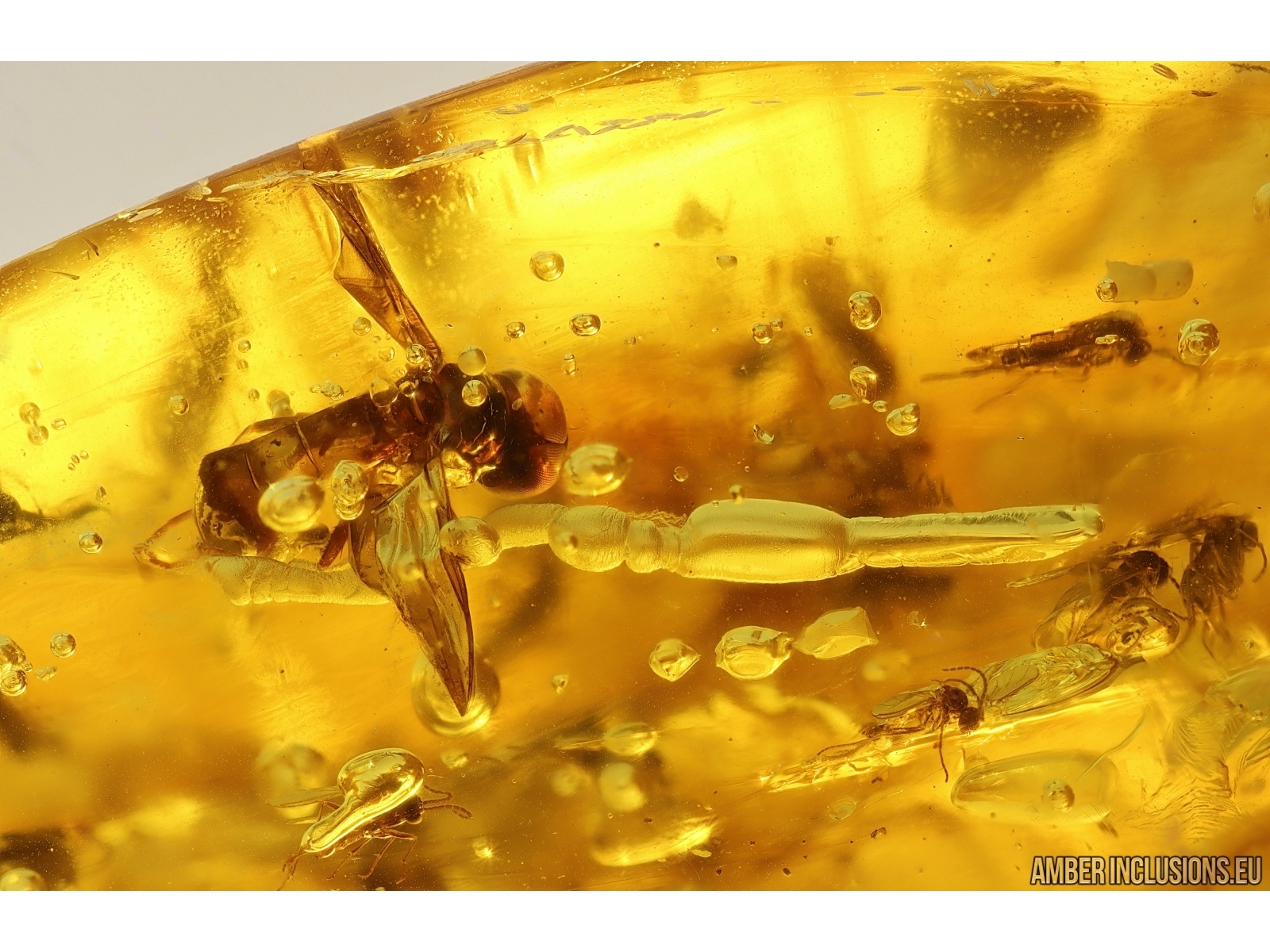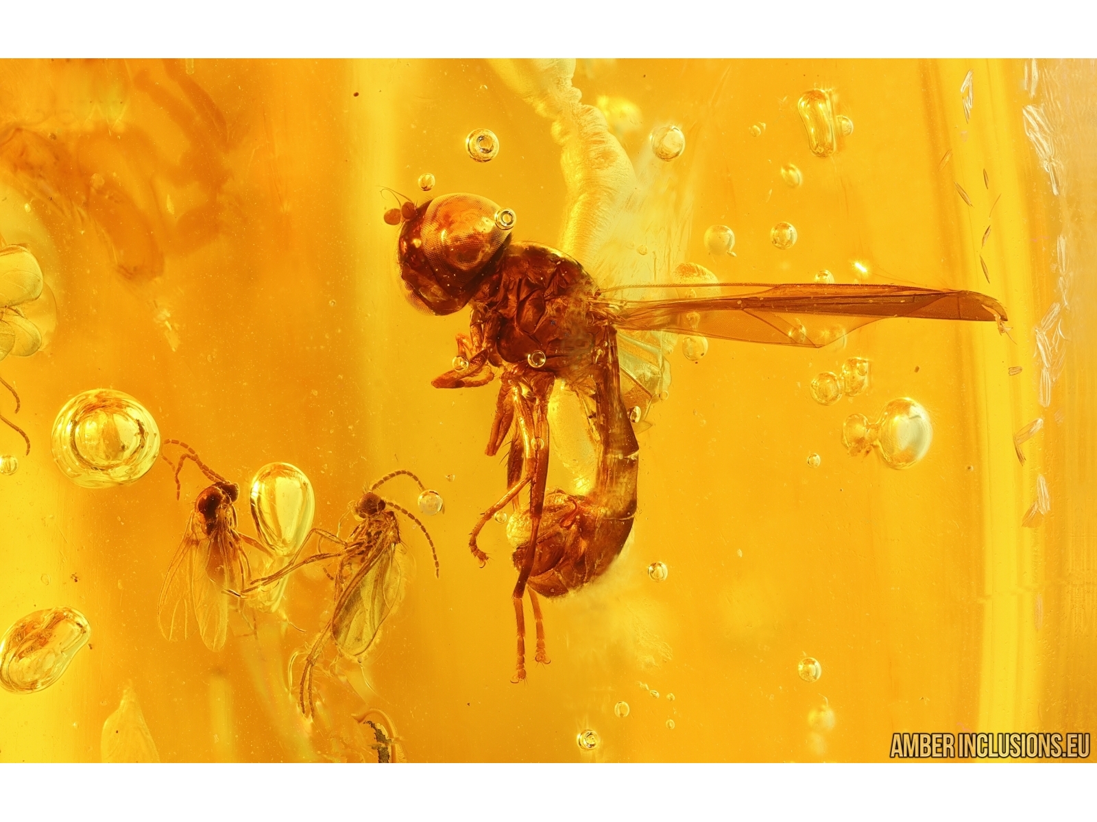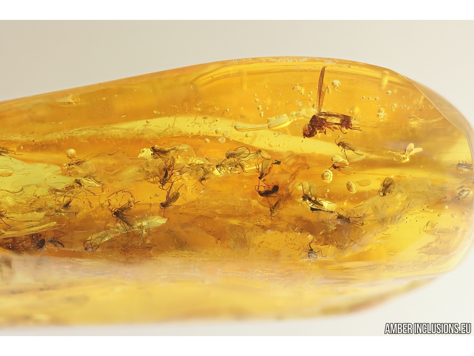 Baltic amber stone with fossil inclusion, trapped 34-56 million years ago - Hover Fly Syrphidae and Swarm of Midges