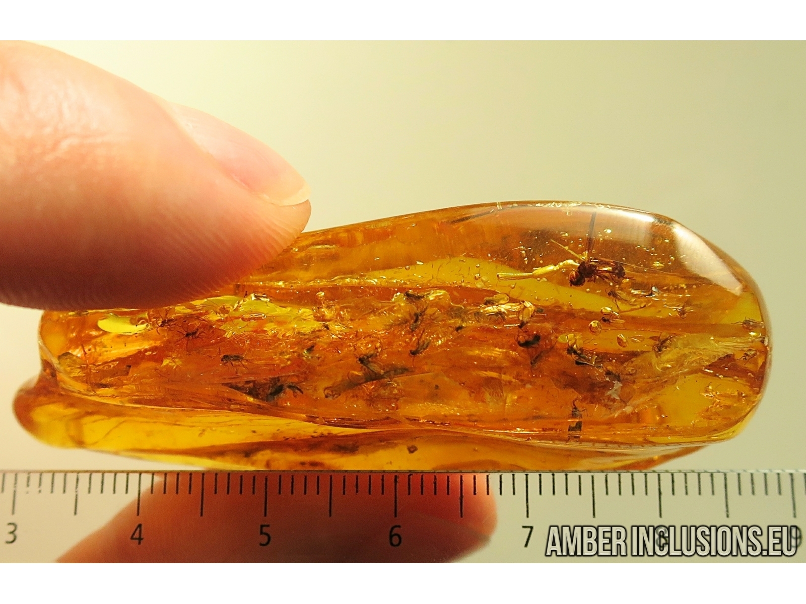 It weighs 12 g. Measurements of stone 60x25x14mm, length of hover fly ~4mm, midges ~1mm.