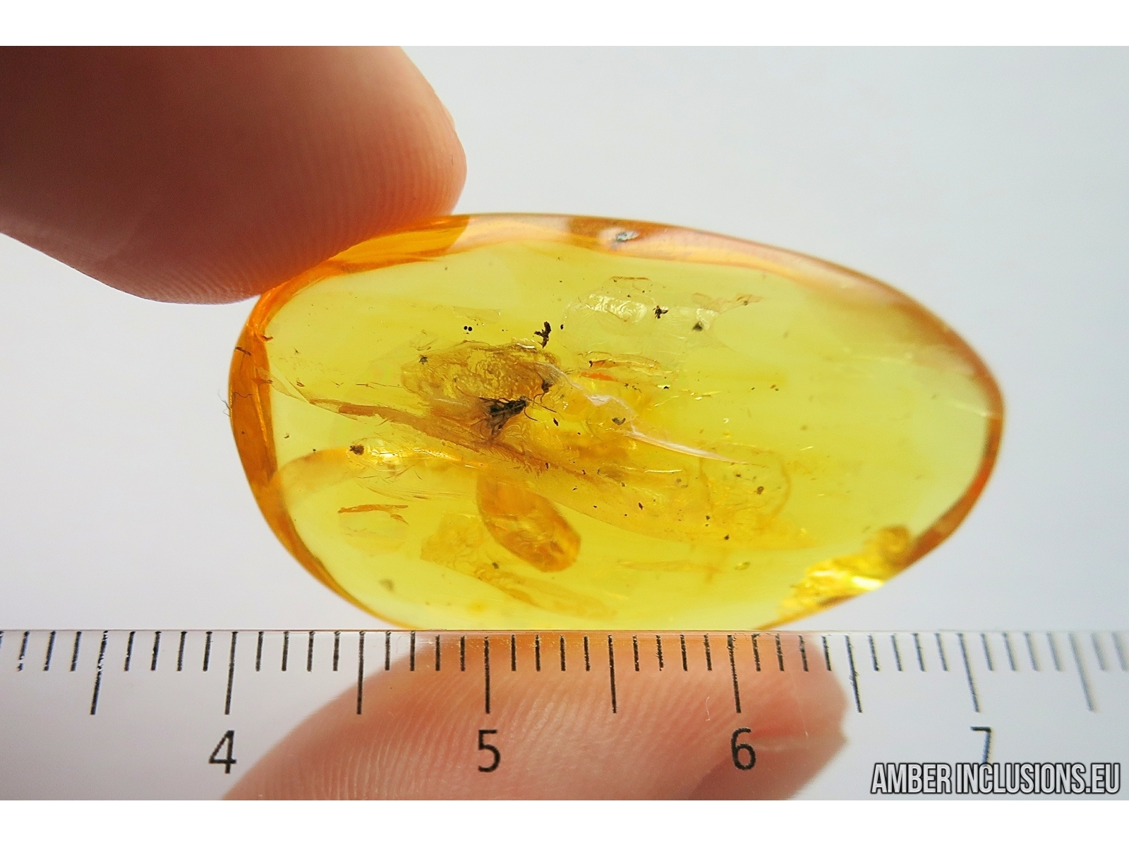 It weighs 3.1 g. Measurements of stone 34x21x7mm, length of braconidae wasp ~2.3mm, air bubble ~2.7mm.