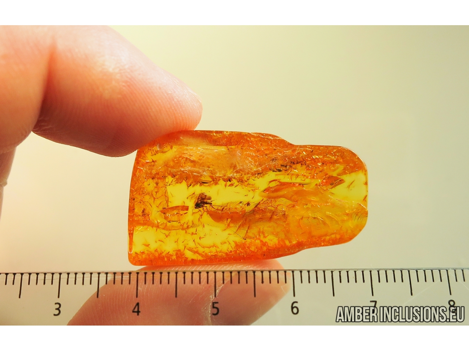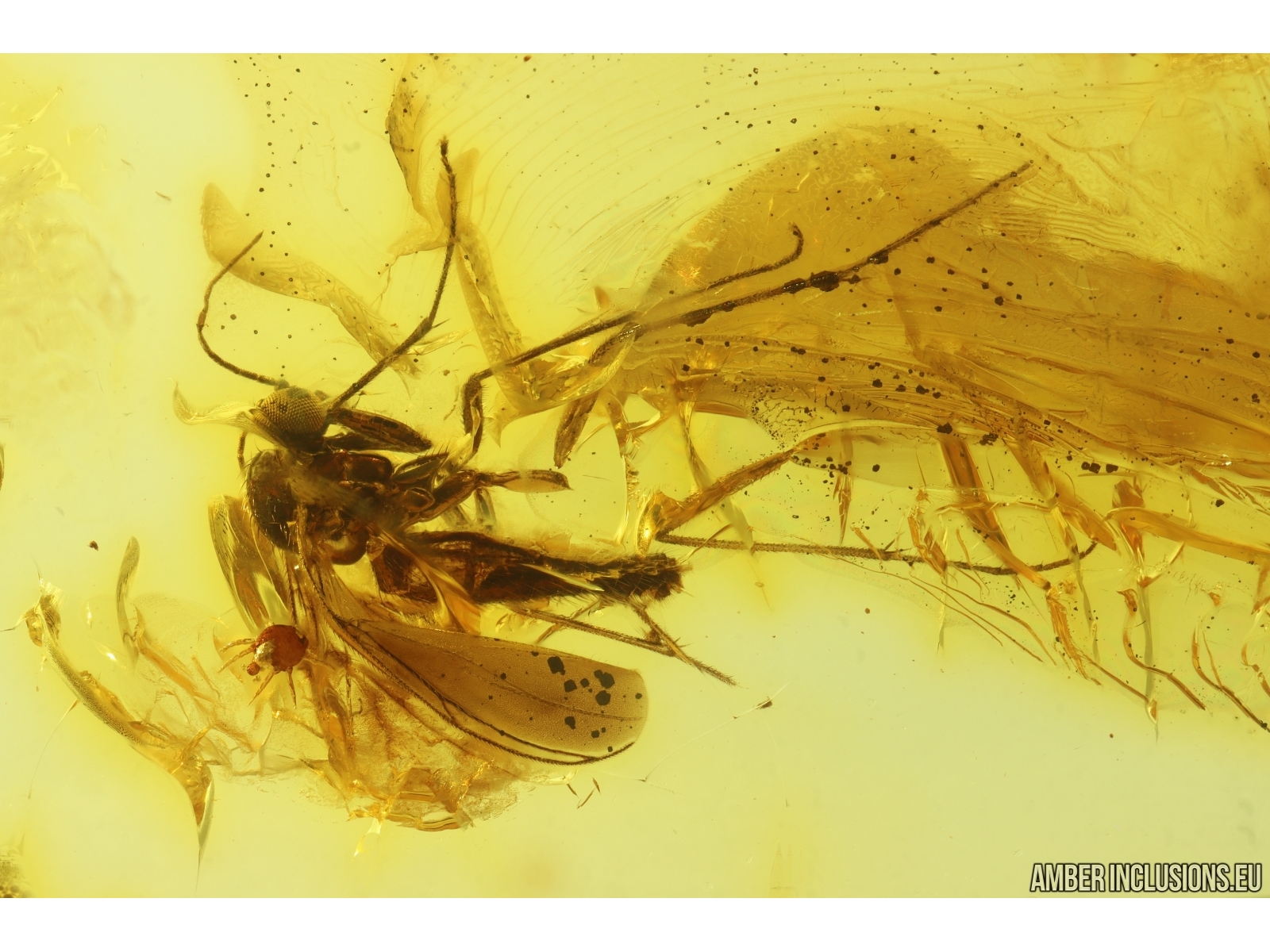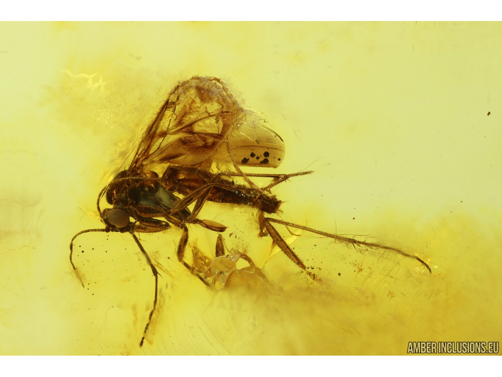 Baltic amber stone with fossil inclusions, trapped 34-56 million years ago - Keroplatidae Fungus gnat with Mite.