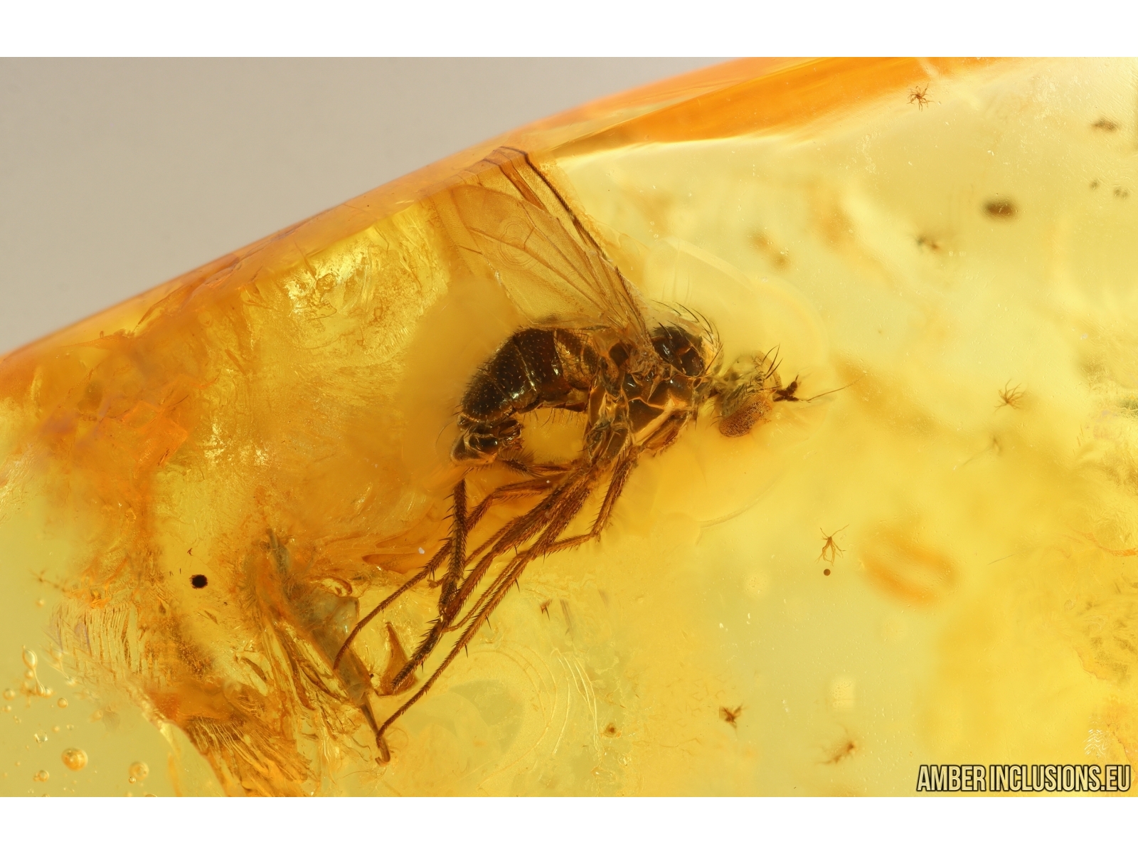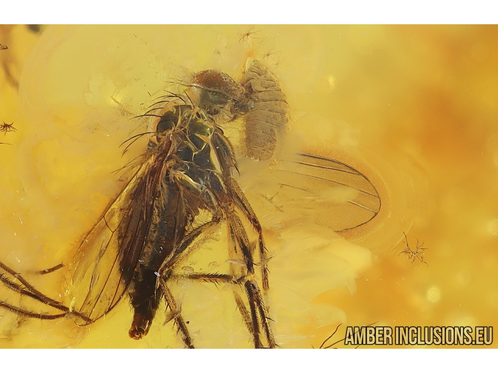 Baltic amber stone with fossil inclusion, trapped 34-56 million years ago - Long-legged flies, Spider, 2 Coccid larvae and Beetle.
