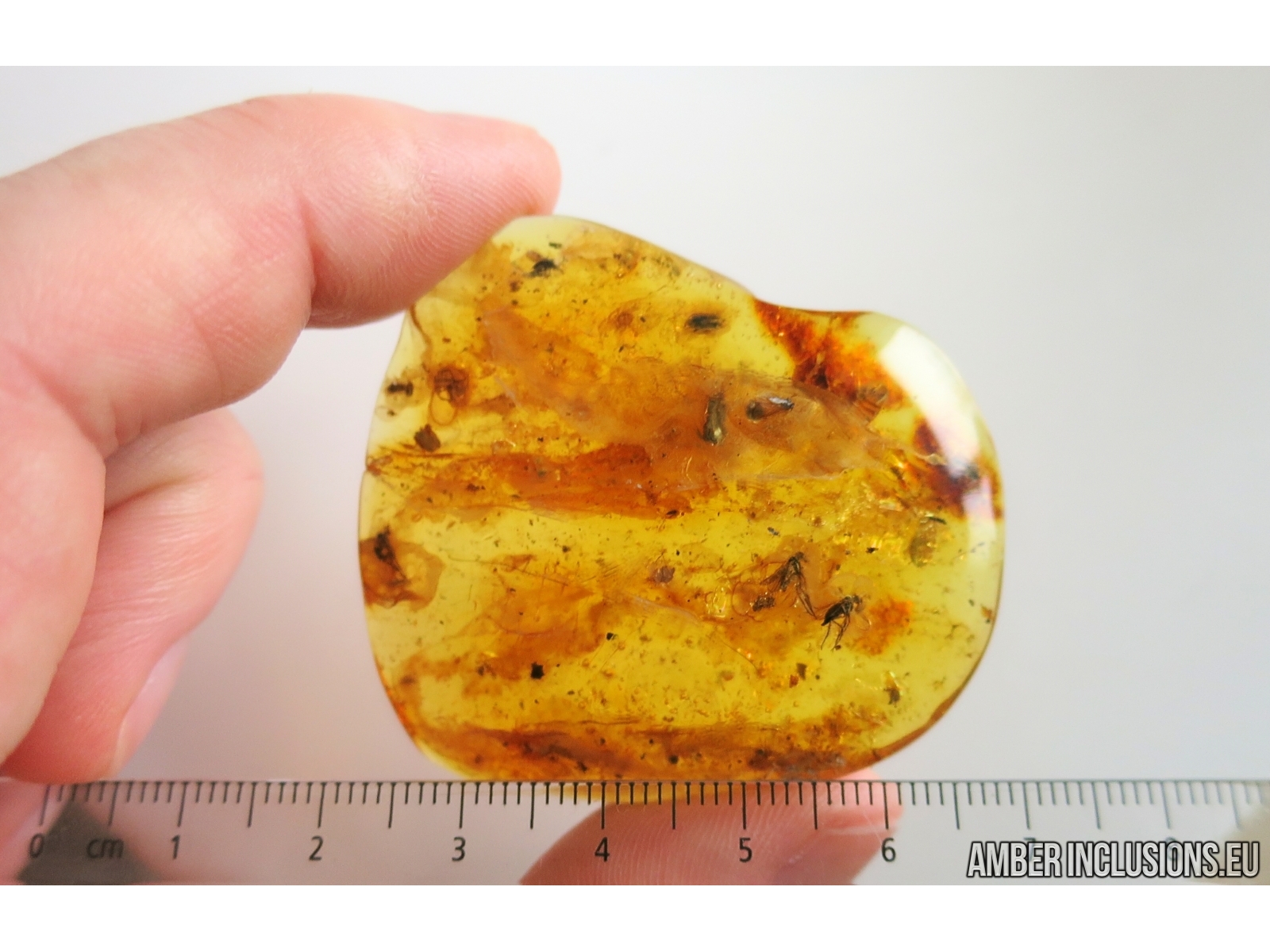 It weighs 10 g. Measurements of stone 48x47x9mm, length of flies ~3.5mm, spider ~3mm, each coccid larva ~1mm, beetle ~3mm.