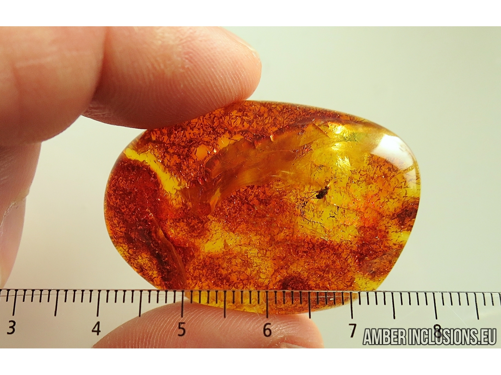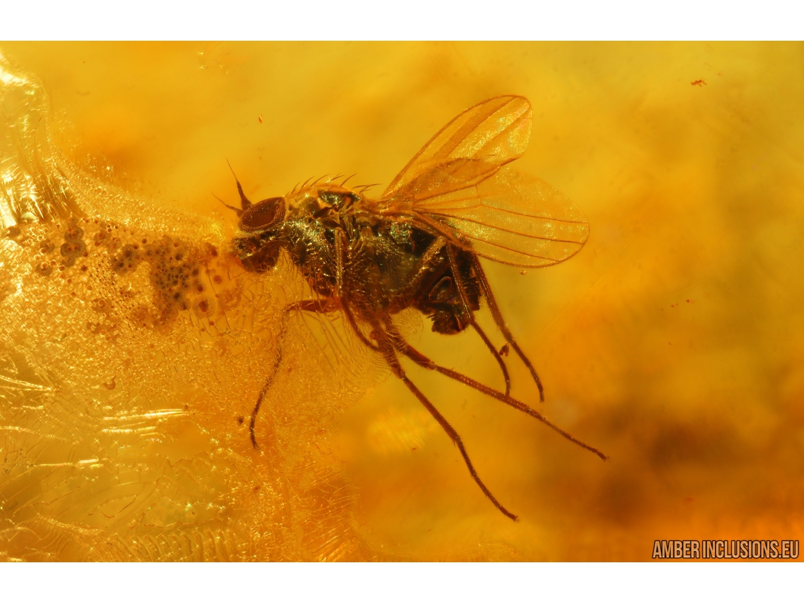 It weighs 6,9 g. Measurements of stone 40x29x10mm, length of fly ~1,5mm.