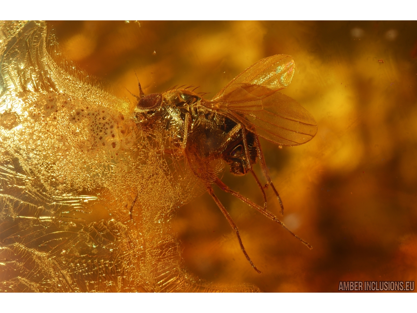 Baltic amber stone with fossil inclusion, trapped 34-56 million years ago - Long-legged fly Dolichopodidae.