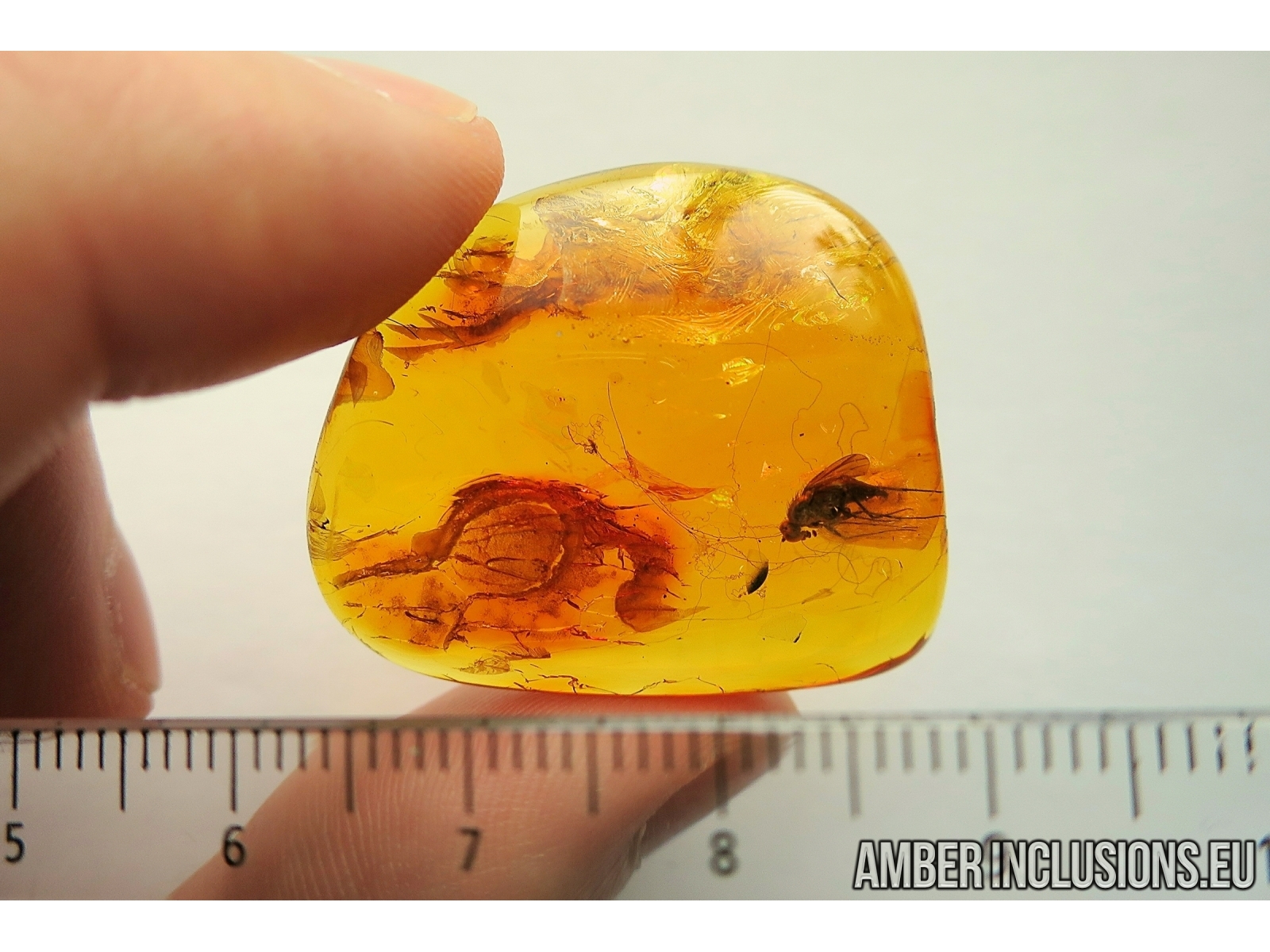 It weighs 5.5 grams. Measurements of stone 35x30x8mm, length of fly body ~6mm, max ~10mm, spider web ~20mm.