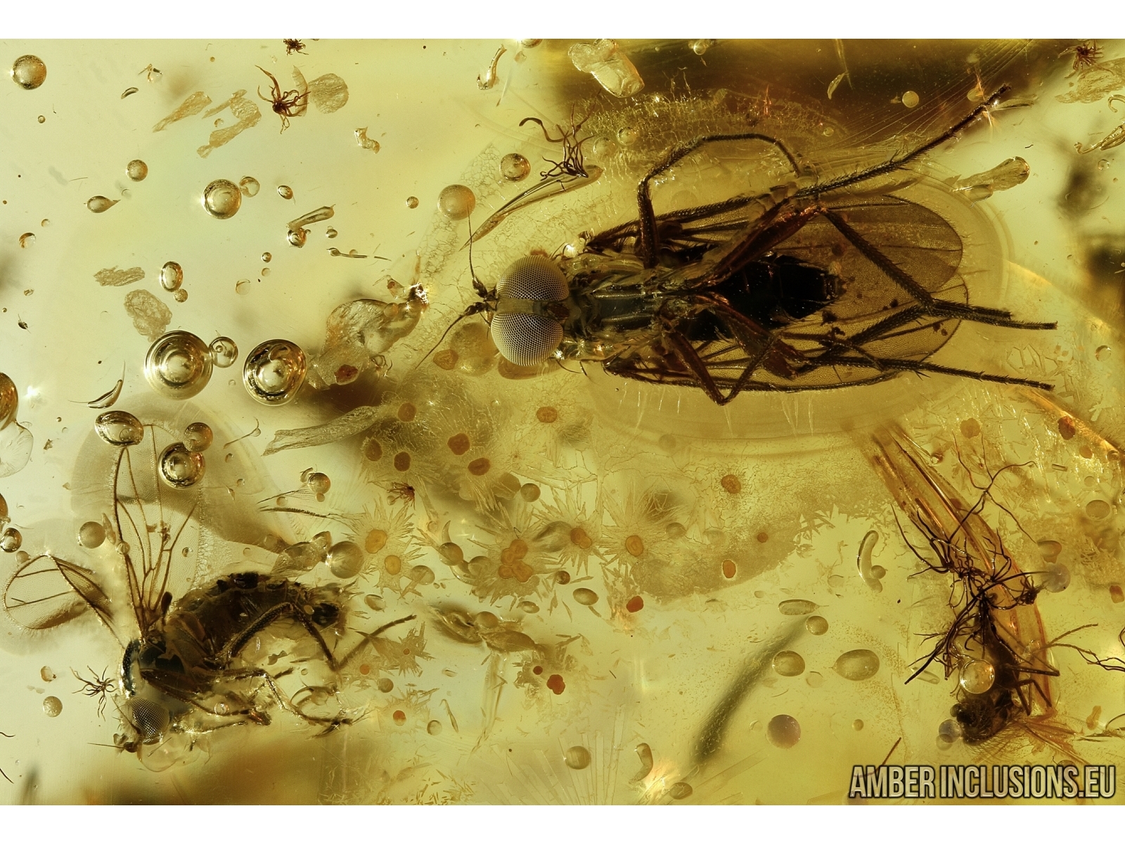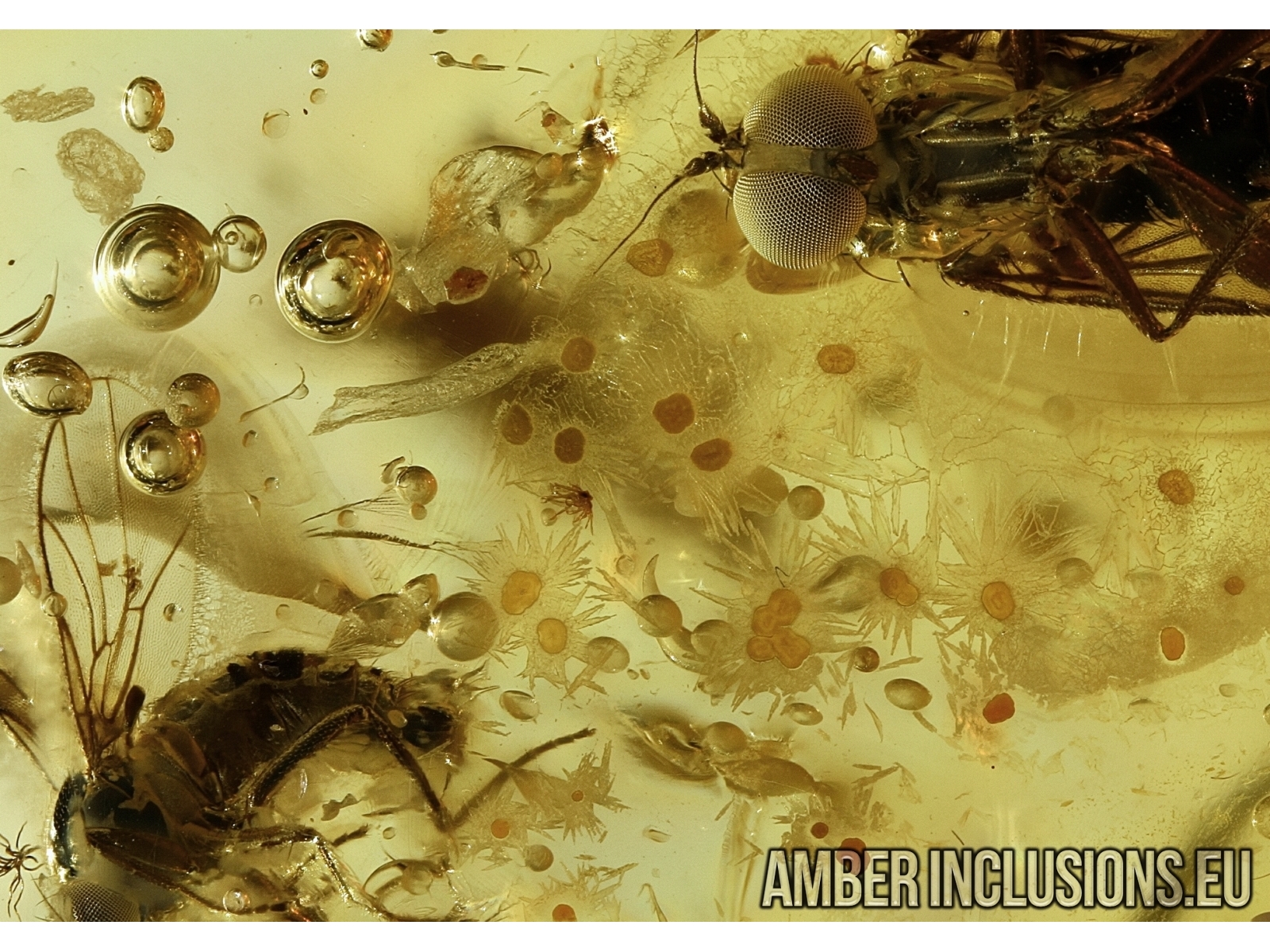 Baltic amber stone with fossil inclusions- Dipterans and Crystals!