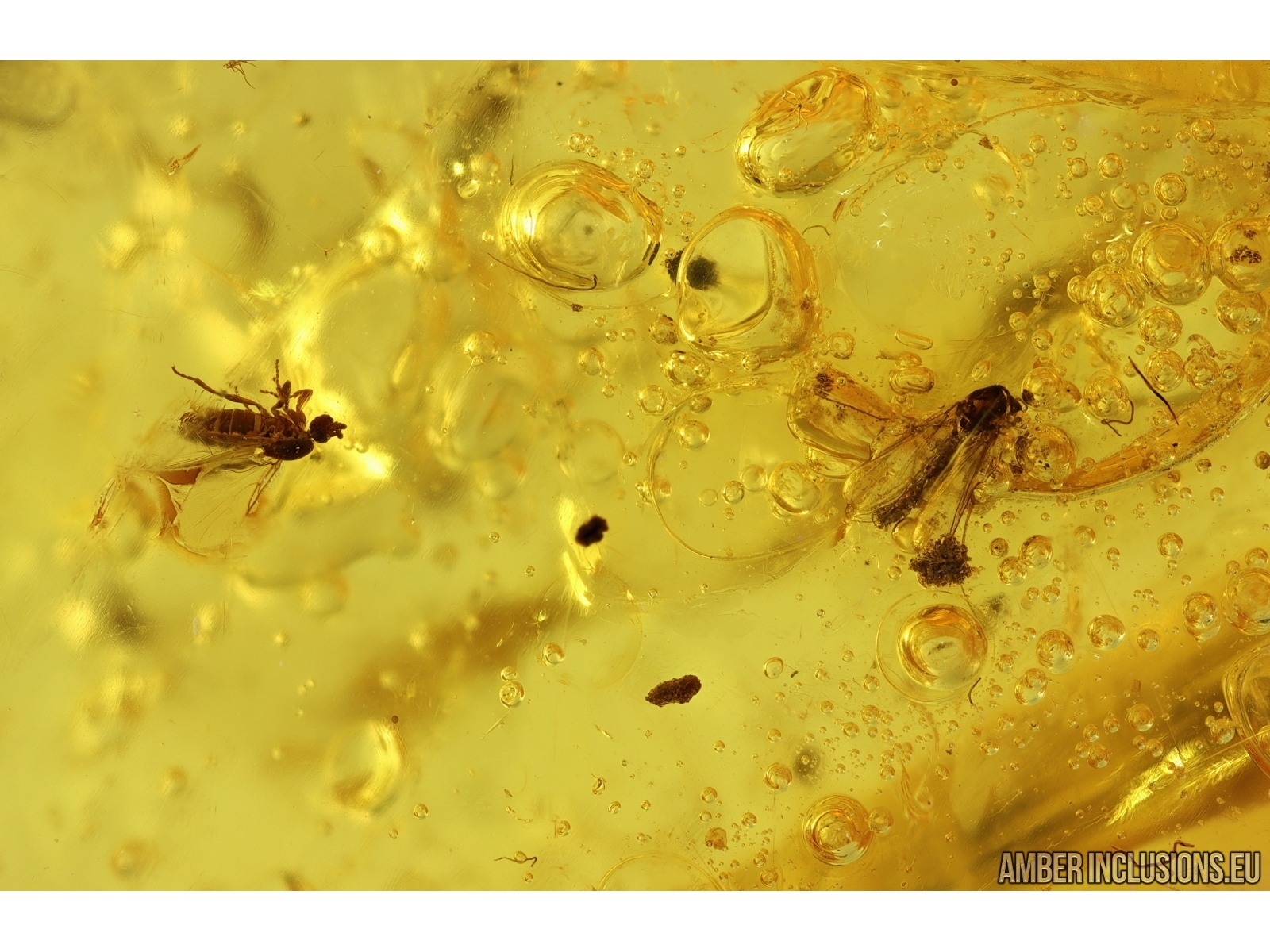 It weighs 3 g. Measurements of stone 37x18x8mm, length of lflower fragments ~5mm, leaf ~6mm, gnats ~1.5mm.