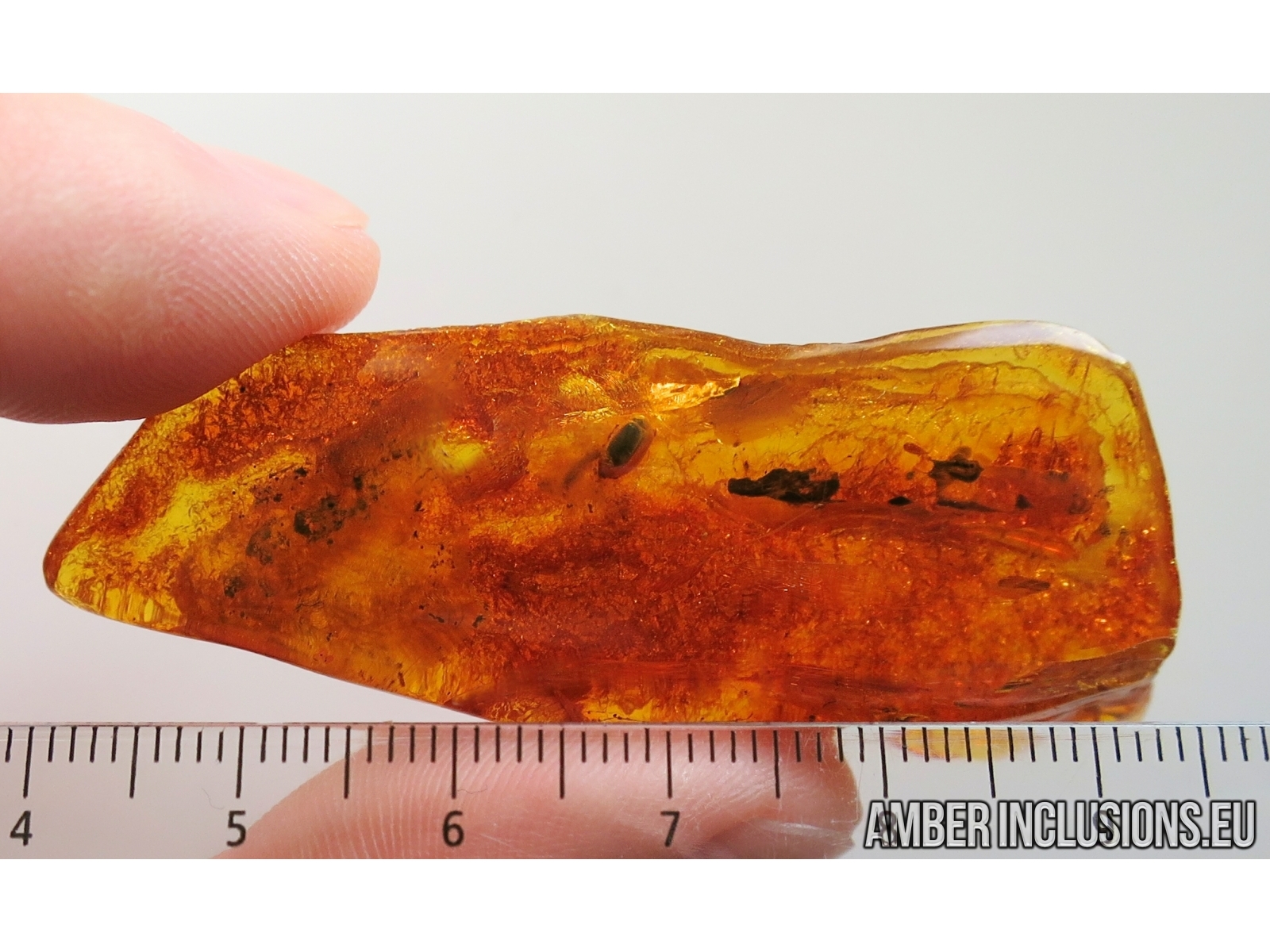 It weighs 7.8 g. Measurements of stone 60x22x9mm, length of beetle ~2.8mm.