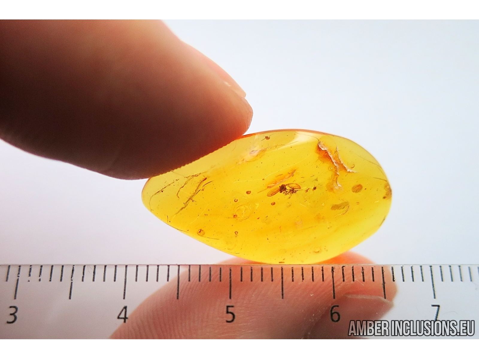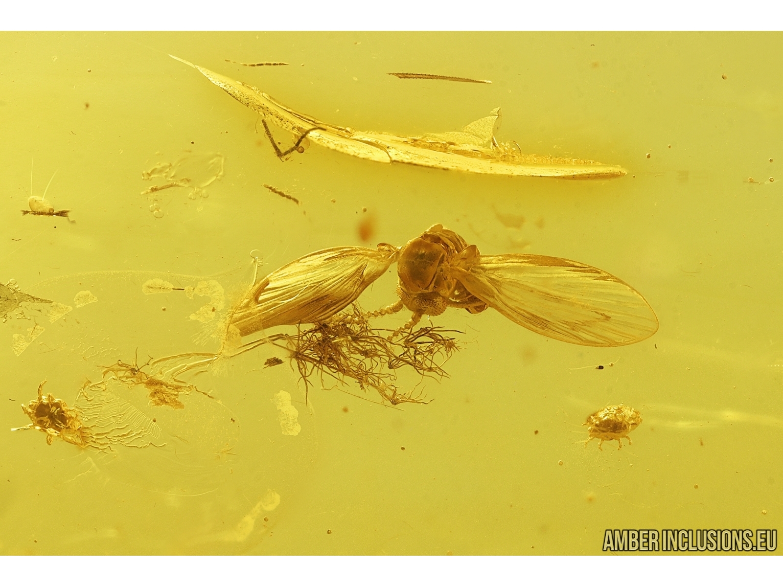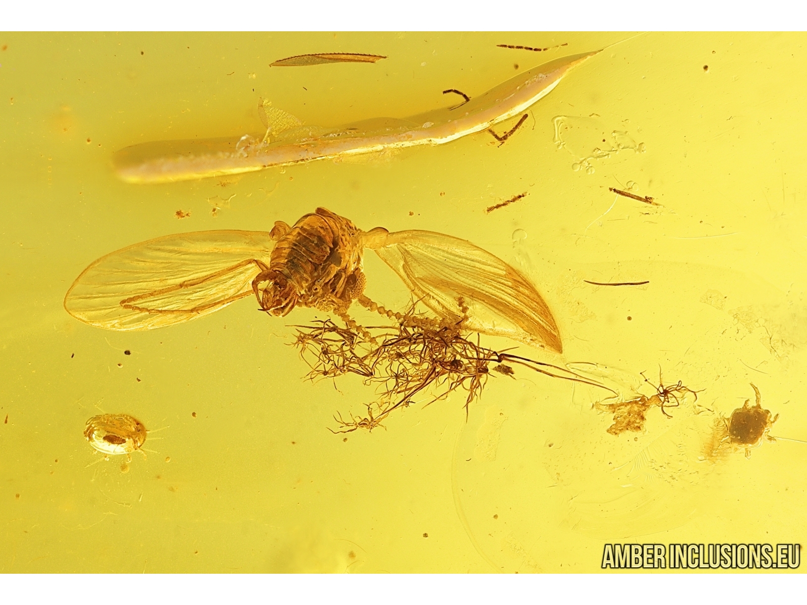 Baltic amber stone with fossil inclusions, trapped 34-56 million years ago - Moth fly Psychodidae and Mites Acari.