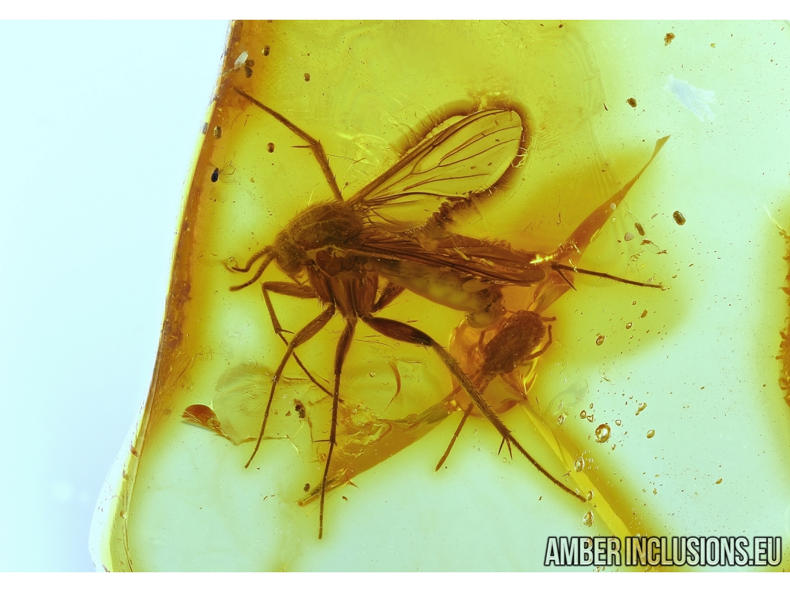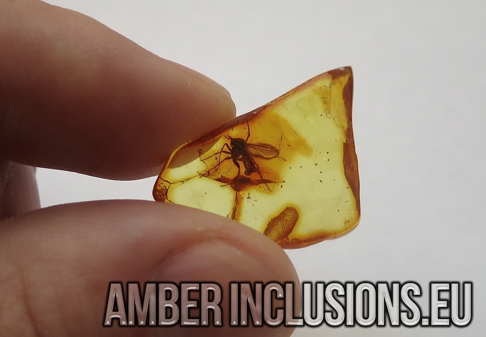 Baltic amber stone with fossil insects - Mycetophilidae, Fungus gnat with Mite Acari, Arachnida