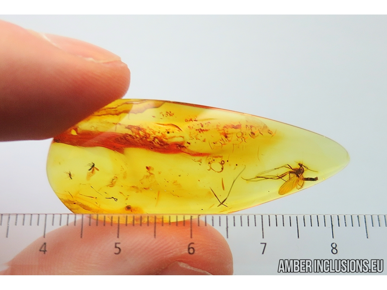 It weighs 2.7 g. Measurements of stone 45x20x7mm, length of gnat body ~4mm, max ~11mm.