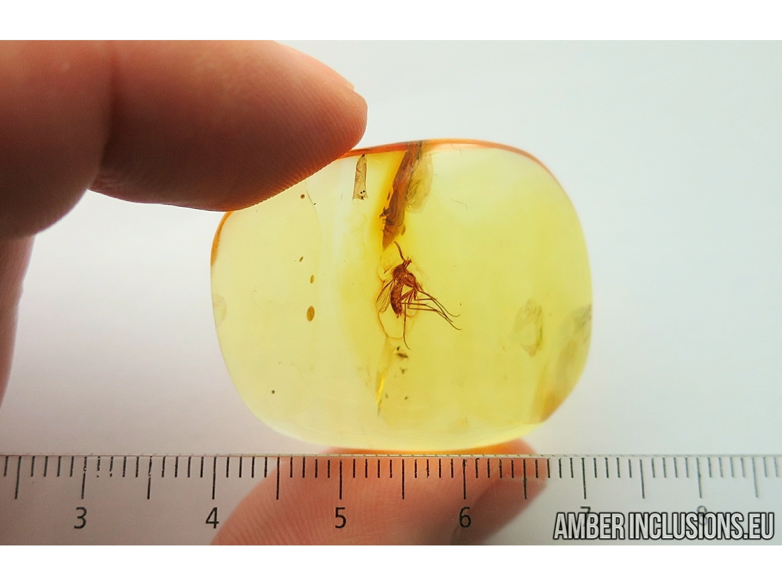 It weighs 5.2 g. Measurements of stone 34x29x8mm, length of gnat body~4.5mm, max ~10mm.