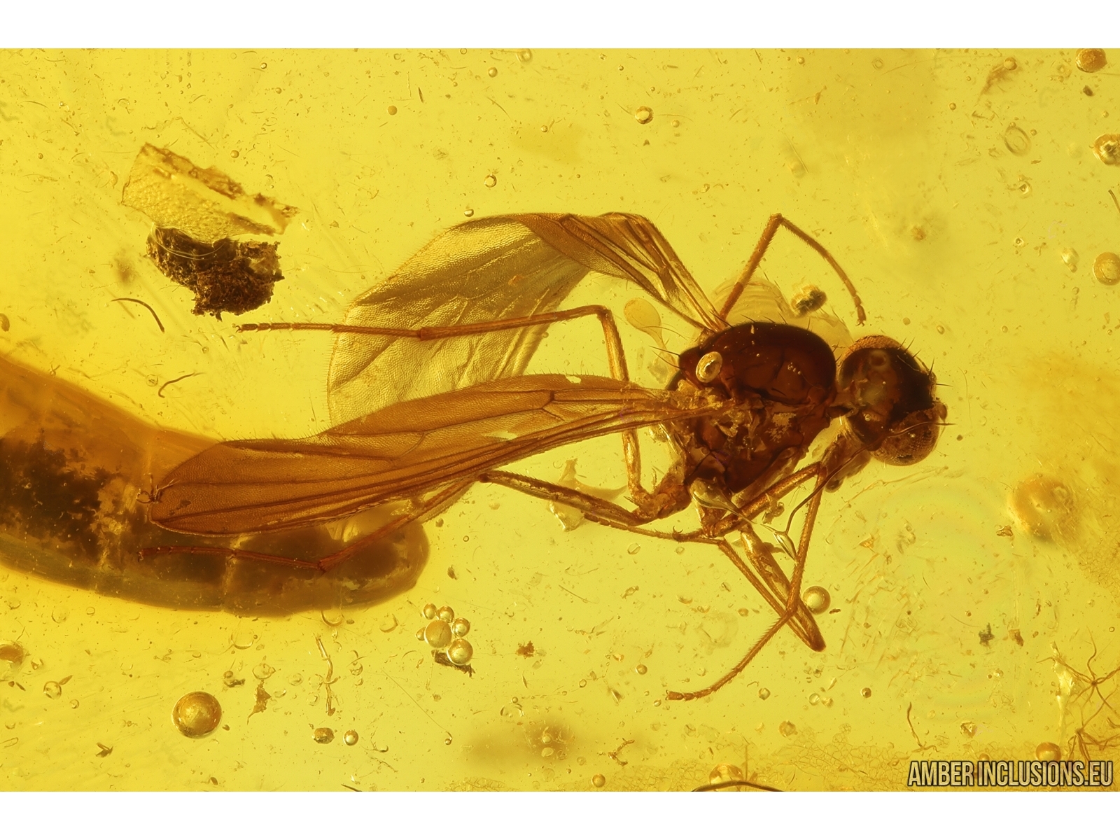 It weighs 1.7 g. Measurements of stone 22x21x7mm, length of larva ~9mm, dance fly Empidoidea ~2.8mm, Sciaridae gnats ~2mm.